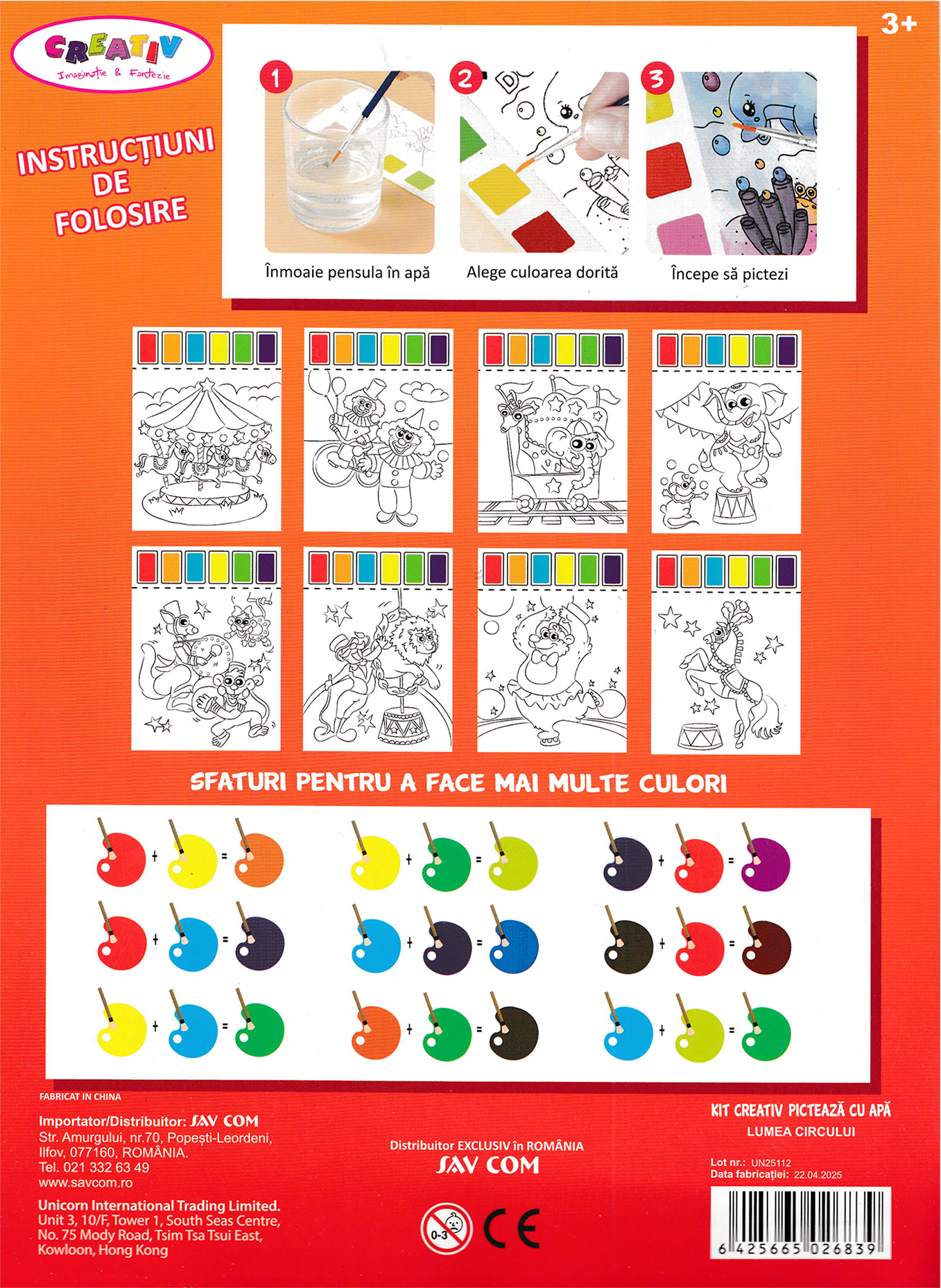 Kitul conține 8 pagini care conțin imagini pentru pictat, 6 culori pe fiecare pagină și o pensulă.