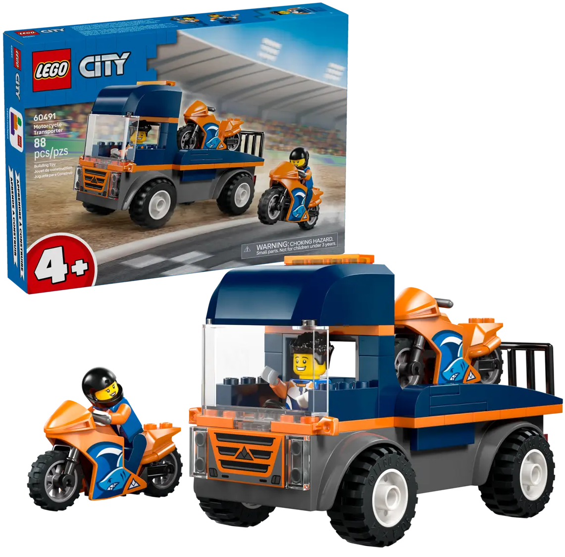 Oferă-le copiilor de 4+ ani un prim pas în joaca fantezistă cu setul LEGO® City Transportor de motociclete (60491). Acest set de vehicule de jucărie include un camion platformă cu anvelope robuste din cauciuc, 2 motociclete sport și 2 minifigurinepiloți, fiecare cu cască. Copiii pot încărca și descărca motocicletele folosind rampa, pot recrea acțiune epică de curse pe două roți și pot așeza o minifigurină în cabină pentru aventuri distractive pe șosea. Acest set de joacă ușor de construit inclu de un element LEGO Starter Brick, un ghid ilustrat simplu și instrucțiuni 3D în aplicația LEGO Builder, un asistent digital pentru construcție, care le permit copiilor să mărească și să rotească modelele, astfel încât să le poată vizualiza din orice unghi pe măsură ce construiesc. Acest set este o surpriză grozavă sau un cadou de ziua de naștere pentru fetele și băieții care iubesc jucăriile de curse, joaca creativă și poveștile fanteziste. Adaugă aceste vehicule de jucărie la alte seturi de construcție (vândute separat) din gama LEGO® City pentru și mai multă acțiune de curse. Setul conține 88 de piese.