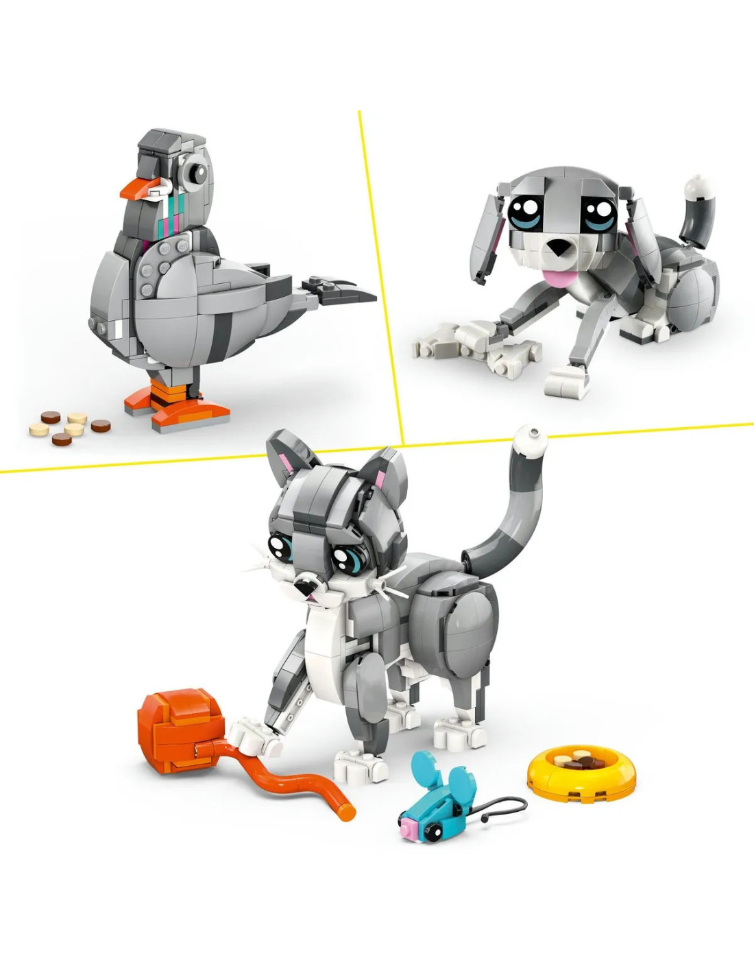 Fetele si baietii pot construi 3 seturi LEGO cu animale diferite folosind aceleasi caramizi o pisica articulata care poate sta jos, in picioare si sa faca salturi un catelus simpatic si articulat cu un os si un porumbel cu firmituri de paine.