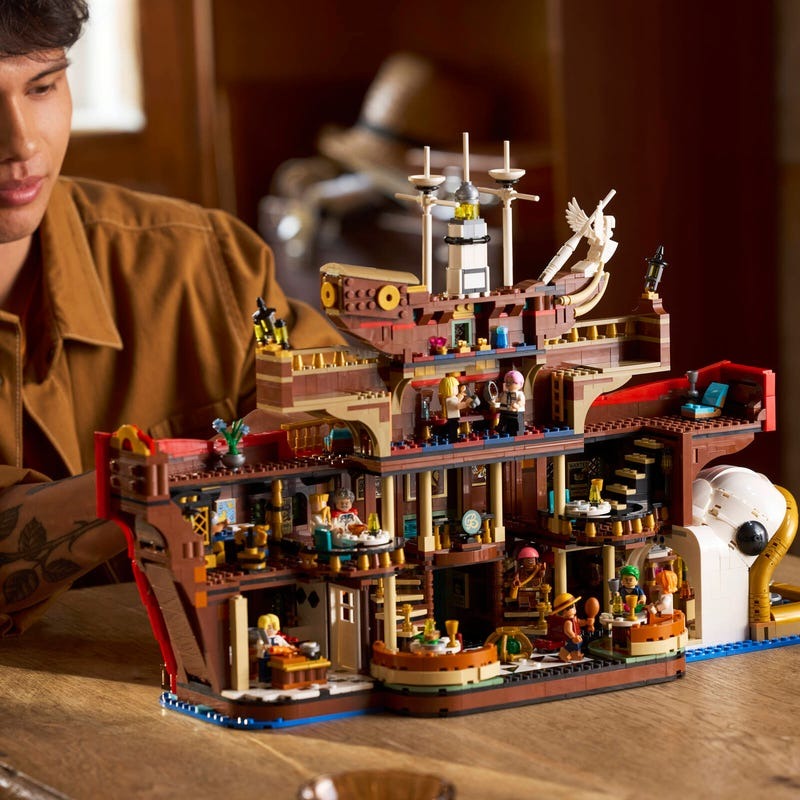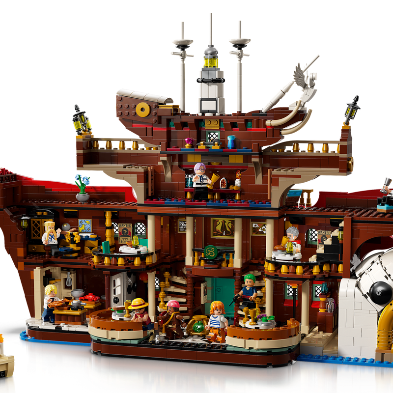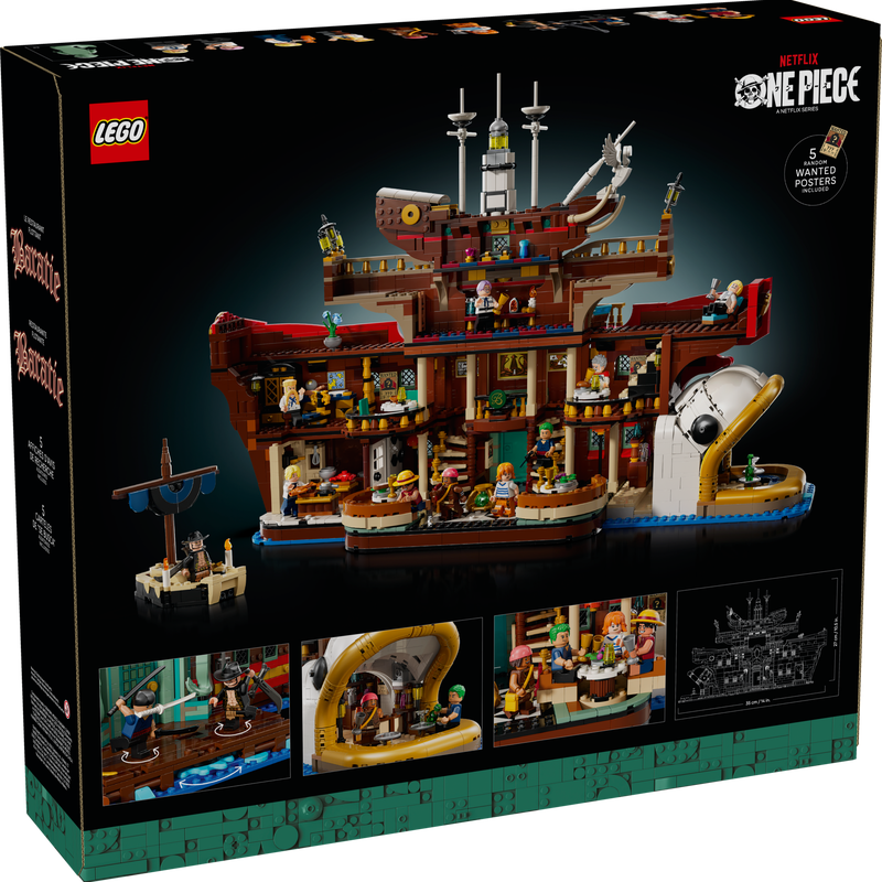 Această impresionantă piesă de etalare în formă de corabie conține multe camere accesibile la interior, incluzând bucătărie și zonă de luat masa, cabina lui Zeff și camera comorilor. Scenele clasice pot fi reproduse cu cele 10 minifigurine LEGO: Luffy, Zoro, Nami, Usopp, Sanji, Zeff, Garp, Helmeppo, Koby și Mihawk. Acest set conține și accesorii autentice, precum 5 postere cu titlul „Căutat”. Aplicația LEGO Builder oferă ocazia utilizatorilor să apropie și să rotească modelele în 3D și să-și urmărească progresul pe măsură ce construiesc.