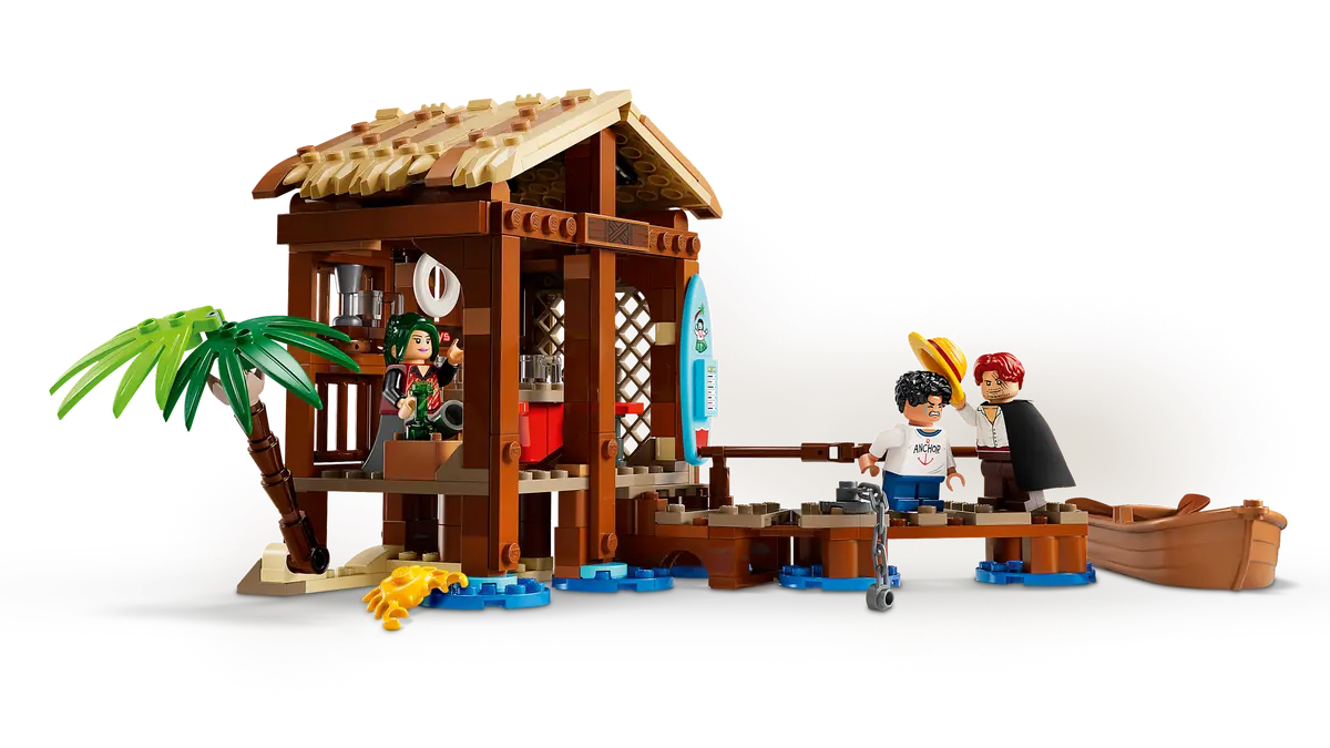 Copiii pot indeparta acoperisul magazinului de pe plaja pentru a avea acces la interiorul sau atractiv. Acolo vor gasi accesorii pentru administrarea magazinului si interactiunea cu clientii. Exista un poster cu un personaj „Cautat” de agatat pe perete si spatiu pentru postere suplimentare cu titlul „Cautat”, disponibile in alte modele LEGO® ONE PIECE (vandute separat). La exterior, gasesti o corabie de pirati atasata de debarcader cu un lant. Setul include minifigurinele Luffy, Shanks si Makino, 3 personaje memorabile din serialul Netflix. Pentru un plus de distractie digitala, constructorii pot apropia si roti modele in 3D si isi pot urmari progresul folosind aplicatia intuitiva LEGO Builder. Setul contine 299 de piese.