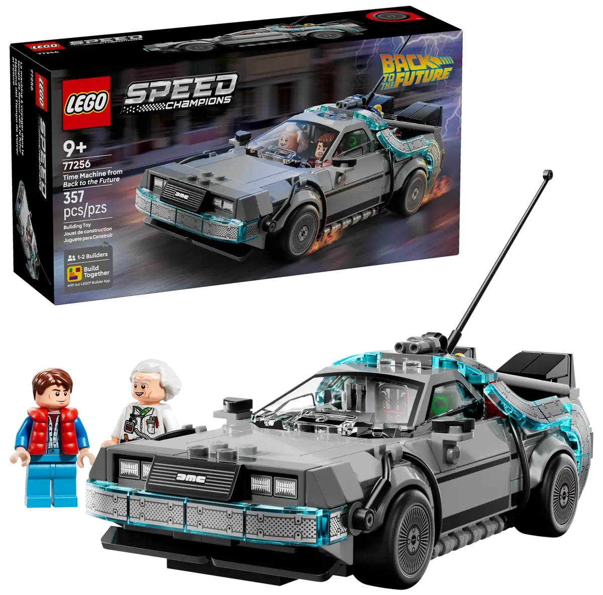 Mașina de jucărie LEGO Speed Champions Time Machine din Înapoi în viitor pentru băieți și fete de peste 9 ani le permite fanilor să construiască, să expună și să recreeze acțiunea din franciza cinematografică emblematică. Acest model de mașină din cărămizi include multe dintre detaliile celebre din cel văzut în filmele populare. Construiește această mașină de jucărie emblematică cu un paratrăsnet și o plăcuță de înmatriculare din California din primul film înainte de a o reconstrui în versiunea sa zburătoare din al doilea film cu Mr. Fusion, o plăcuță de înmatriculare portocalie și roți laterale. Ambele versiuni au guri de aerisire spate, o cabină de pilotaj, condensator de flux și calculator de timp.