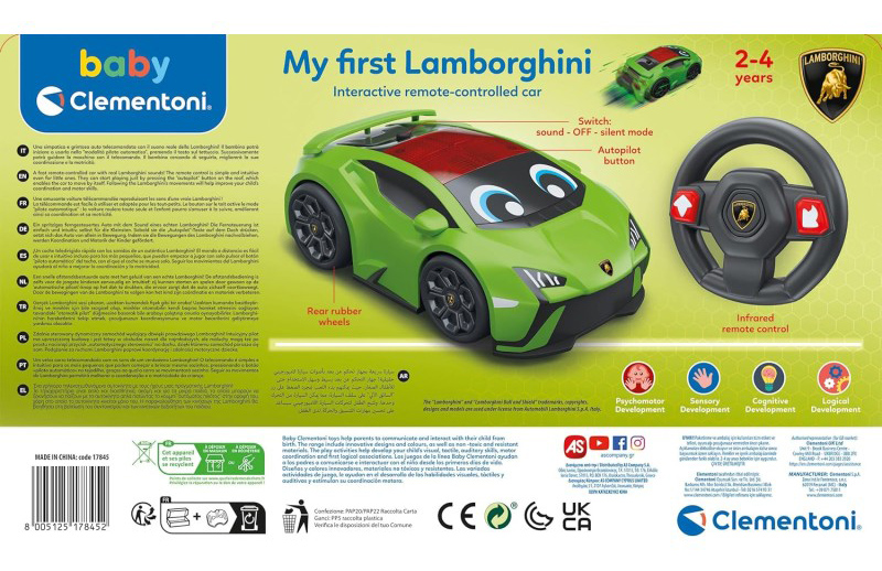 Niciodata nu e prea devreme pentru masina visurilor tale... Masinuta Lamborghini cu telecomanda de la Baby Clementoni poate fi controlata cu ajutorul telecomenzii infrarosu, usor de folosit si intuitiva. Copilul se va distra controland masina si interactionand cu ea, bucurandu-se de multe sunete realiste. Jucaria stimuleaza coordonarea mana-ochi. Urmarind masina, copilul isi va putea dezvolta abilitatile motorii. Designul inconfundabil al Huracan se combina cu experienta si siguranta jucariilor si jocurilor Clementoni.