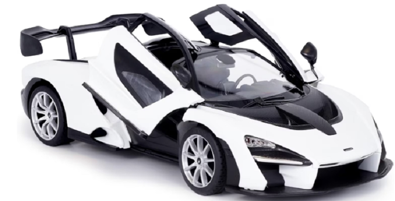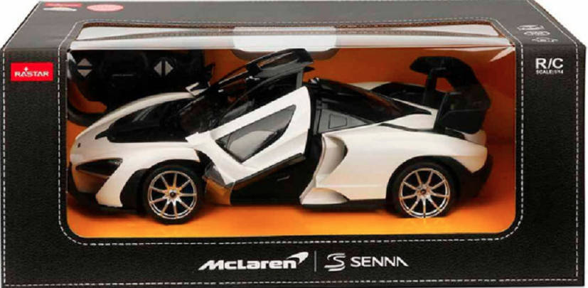 Masina cu telecomanda MCLAREN SENNA ALB, scara 1 la 14, poate rula cu o viteza aproximativa de 10km/h, are tractiune 2WD, anvelope de cauciuc, posibilitate de reglaj a directiei direct pe sasiu si o raza de actiune a telecomenzii de circa 20 de metri.