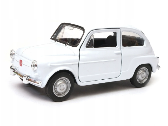 O copie sofisticată a mașinii retro Fiat 600, din piese metalice și plastice. Modelul este disponibil în trei versiuni - alb, galben și roșu. Modelele sunt potrivite pentru aproape toate generațiile datorită manoperei lor. Sunt potrivite nu numai pentru joaca copiilor, ci și pentru colecționari. Mașina are un mecanism de tragere înapoi și uși care se deschid și este realizată la o scară de 1:34 - 1:39.