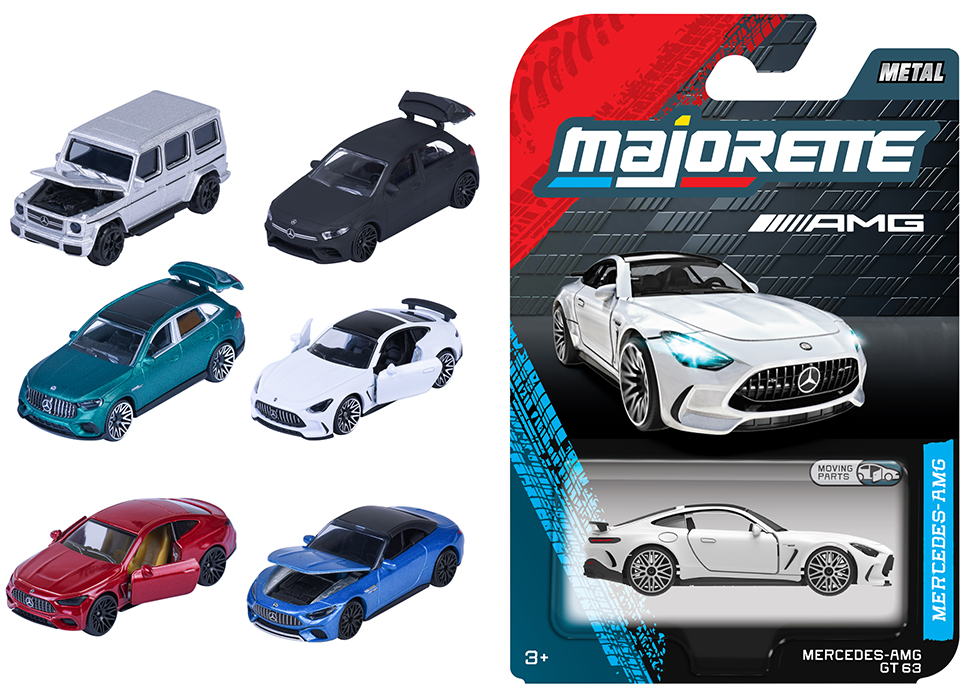 Vehicul metalic cu roți libere, reproduceri ale modelelor Mercedes-AMG la scara 1/64. Pe lângă funcțiile de joc Premium, mașinuțele sunt dotate cu roți din cauciuc și părți mobile.