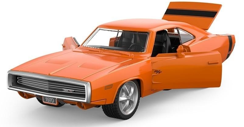 Această mașinuță metalică '70 Dodge Charger R/T prezintă anvelope din cauciuc, cu un design interior-exterior foarte bine realizat.