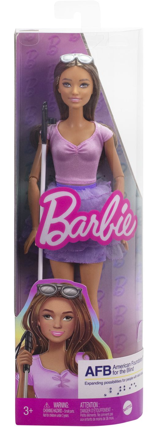 In parteneriat cu Fundatia Americana pentru Nevazatori! Va prezentam prima papusa Barbie Fashionistas nevazatoare! Barbie a incheiat un parteneriat cu Fundatia Americana pentru Nevazatori pentru a dezvolta o papusa care reprezinta cu acuratete o persoana nevazatoare sau cu deficiente de vedere. Poarta o bluza roz satinata si o fusta stralucitoare cu volane, confectionata dintr-un material placut la atingere! Pantofii cu barete de culoare lavanda adauga o nota suplimentara de stil aspectului ei dragut. Inchizatoarele stralucitoare, contrastante, de pe spatele topului si de pe talia elastica a fustei faciliteaza imbracarea papusii Barbie! Ochelarii ei de soare aviator argintii nu sunt doar super cool, ci sunt si practici! „Lentilele” ii protejeaza ochii de razele UV atunci cand este soare. Barbie exploreaza orasul cu un baston alb. Este un accesoriu esential pentru tinuta ei casual, perfect pentru un weekend distractiv cu prietenii! Aceasta papusa Blind Fashionistas este realizata cu dragoste in toate privintele, de la bratele articulate care faciliteaza utilizarea bastonului, pana la ambalajul cu cuvantul „Barbie” in Braille.