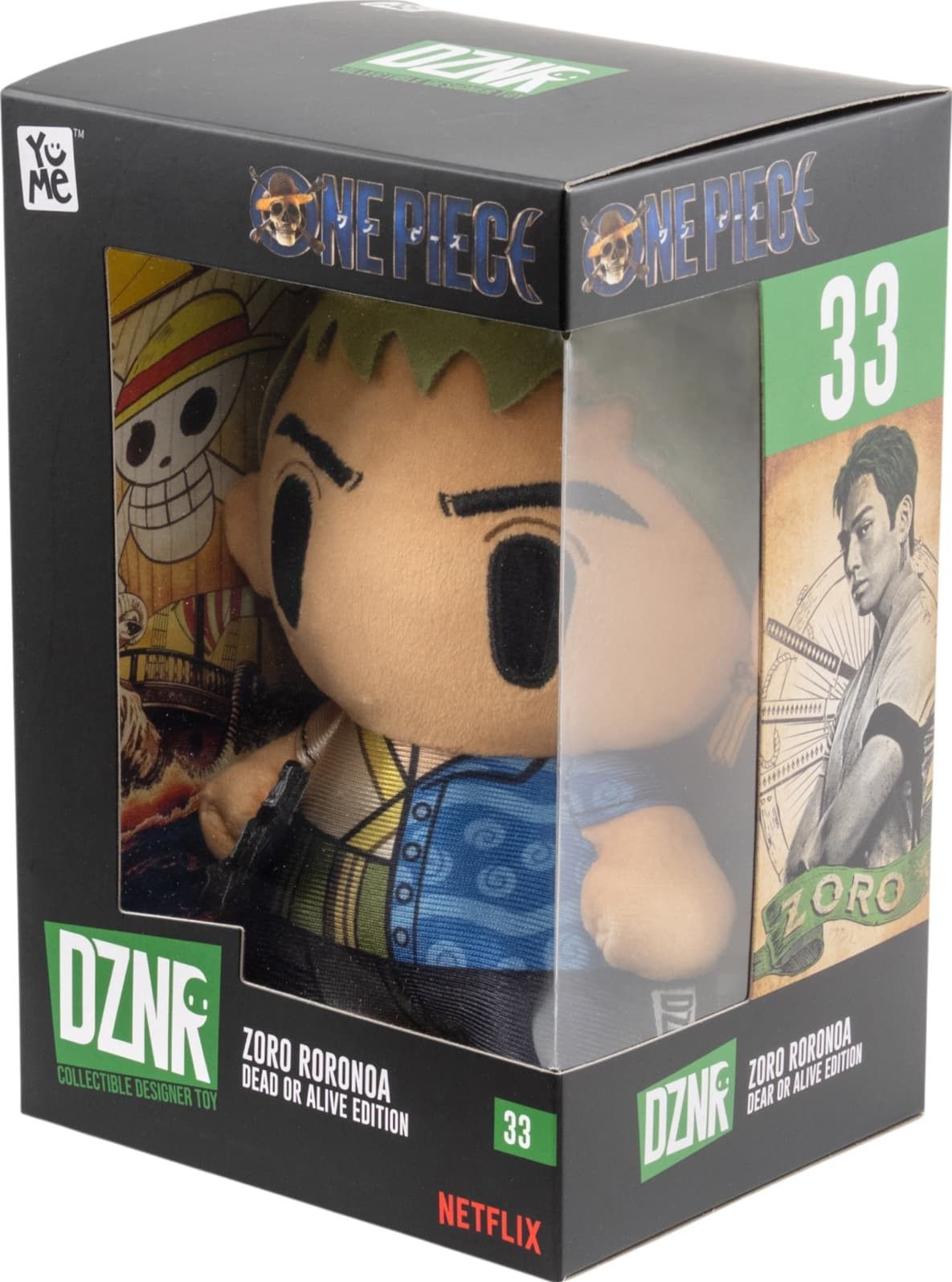 Celebrează universul One Piece cu plușul de colecție YuMe DZNR reprezentându-l pe Zoro, ediția „Mort sau Viu”.