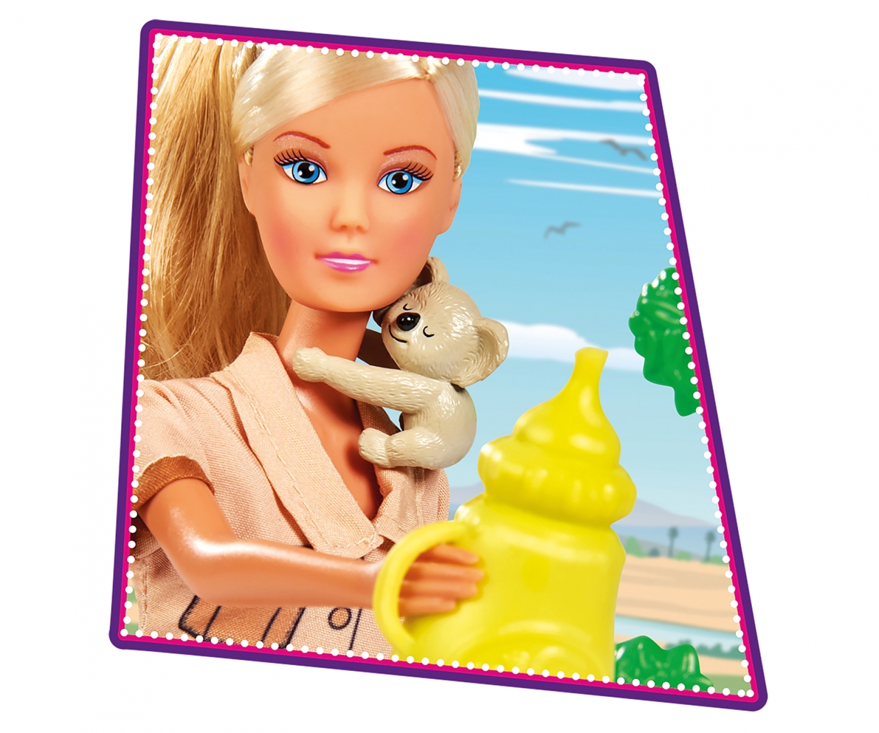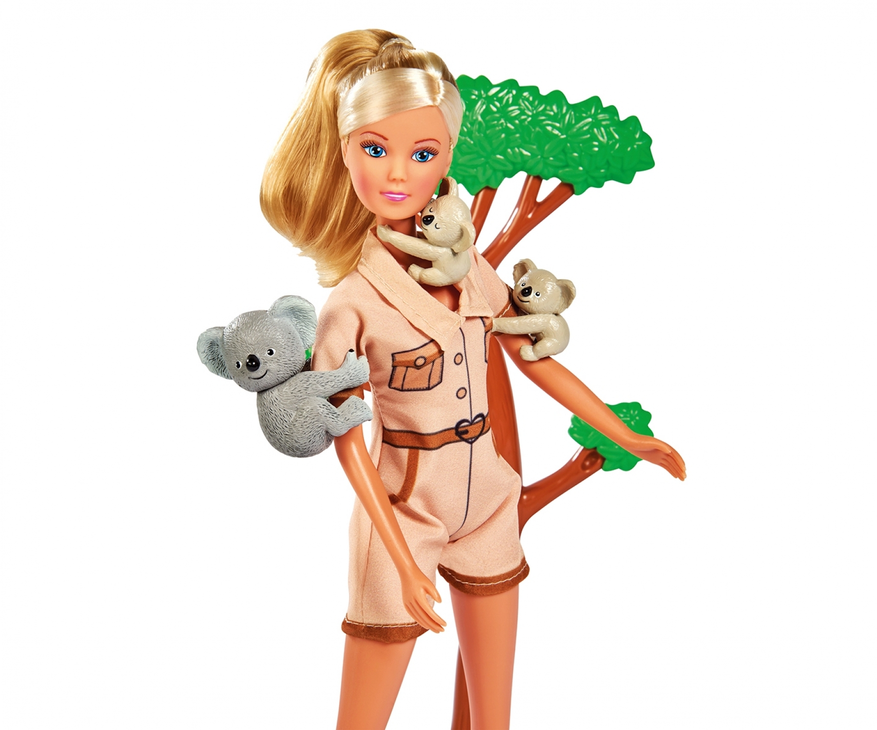Steffi ca zoolog - Steffi poarta un costum bej si are grija cu drag de o familie de koala. Mama koala poate fi agatata pe copacul catarator alaturi de cei doi copii ai ei. O mare varietate de subiecte - gama Steffi LOVE include multe categorii diferite, cum ar fi moda, basm, animale, cai si lumi vii. Datorita varietatii subiectelor, fetele se pot cufunda mereu in roluri noi si le pot interpreta.