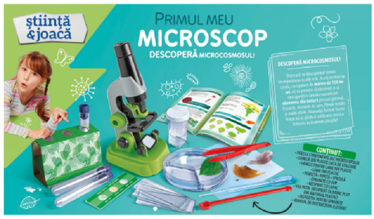 Un set complet cu ajutorul caruia copilul poate invata sa asambleze si sa utilizeze primul sau microscop. Prin lentile va descoperi uriasa lume microscopica! Mareste de 150 de ori!