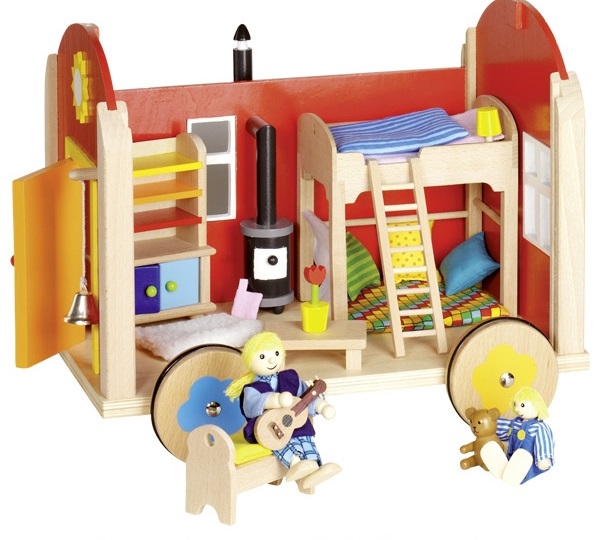 Rulotă din lemn deja asamblată, complet echipată pentru joacă și dormit.