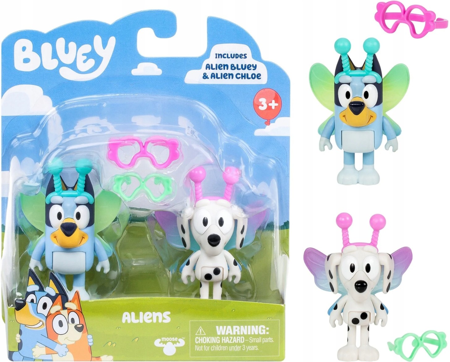 Acest set Bluey 2-Pack conține două figurine Bluey și Chloe de 6,4 cm cu accesorii pentru costume de extratereștri!