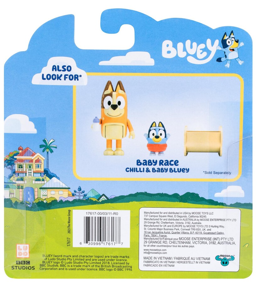 Adu acasă distracția și joaca plină de imaginație a lui Bluey și a familiei sale cu acest adorabil set de figurine Bluey Cursa Bebelușilor! Acest set este inspirat din episodul „Cursa Bebelușilor”, în care Chilli își amintește de Bluey și Judo când erau bebeluși și încercau să vadă cine va merge primul. Pachetul conține două figurine de 6,5 cm – Chilli și Bluey bebeluș – plus un accesoriu leagăn, perfect dimensionat pentru Bluey bebeluș. Chilli are brațe și corp articulabile, iar ambele figurine au dimensiuni ideale pentru mâinile micuților. Copiii vor adora să recreeze unele dintre cele mai memorabile momente din serial cu aceste jucării adorabile!