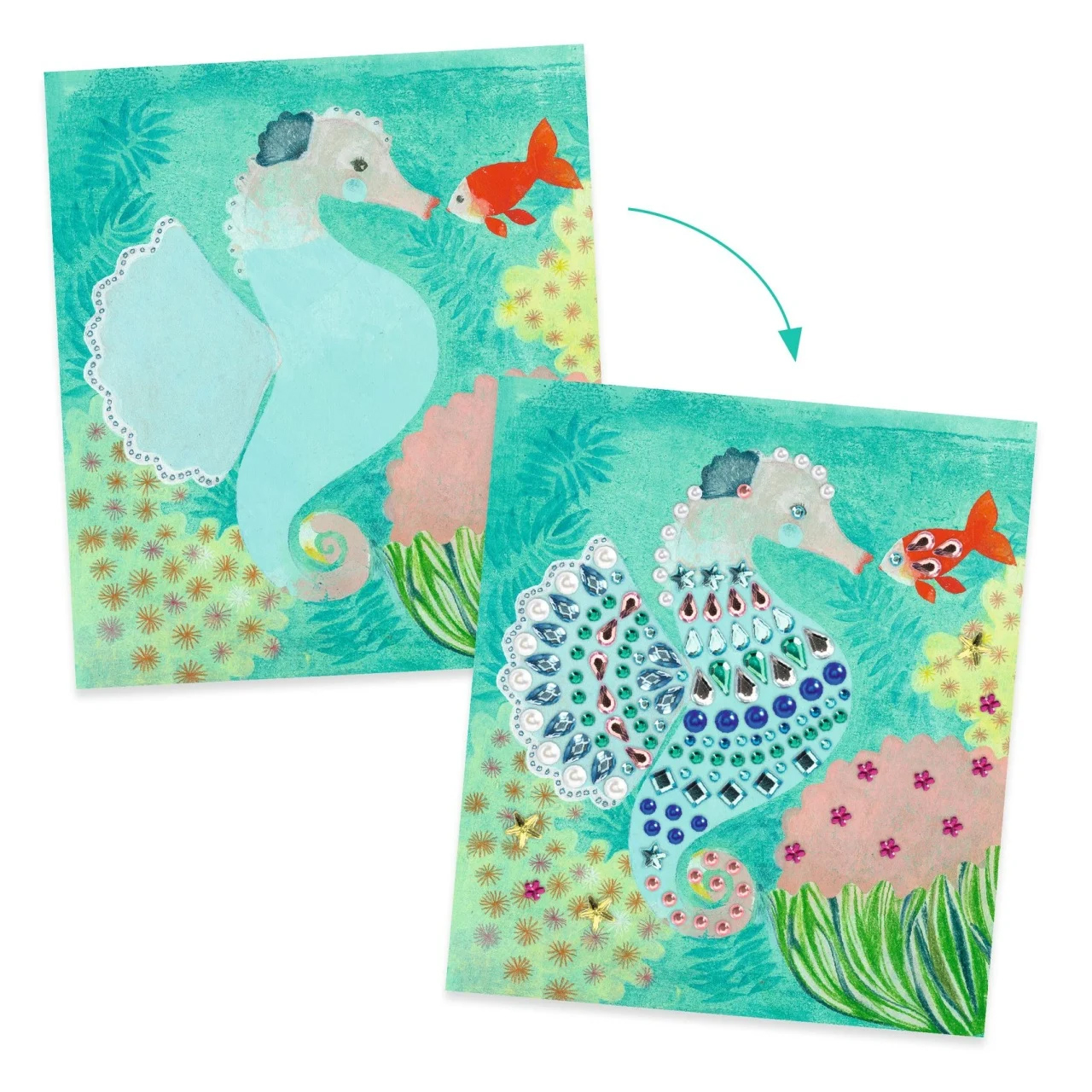 Kit pentru decorarea a 4 planșe ilustrate cu tot felul de mini diamante fațetate în diferite forme și culori. Fiecare foaie de strasuri se potrivește cu o imagine care urmează să fie decorată. Urmând instrucțiunile pas cu pas furnizate, puteți adăuga treptat imaginilor un efect 3D strălucitor.