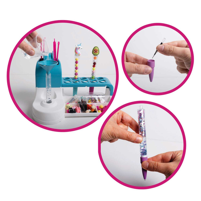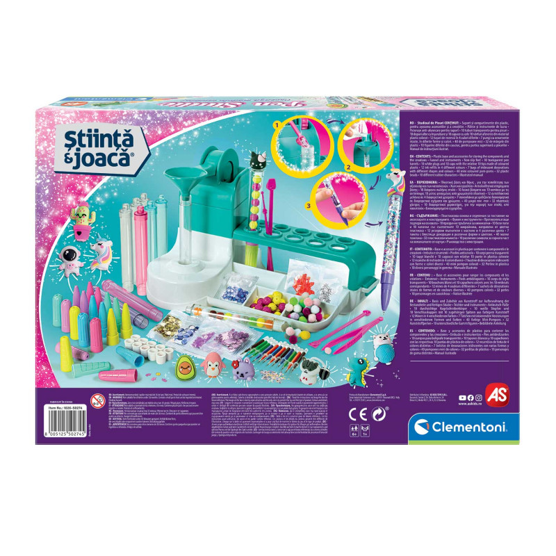 O idee originală de artizanat nouă, cu tot ce au nevoie copiii pentru a face pixuri colorate și a le decora cu multe detalii. Toate componentele pachetului au locul lor special pe baza specială. Acest kit complet include tot ce au nevoie copiii pentru a face 10 pixuri. Include: cerneală, pâlnie, corpuri de pix transparente în roz, albastru și clar, vârfuri decorative de pix în formă de animale, pietre strălucitoare, biluțe etc.