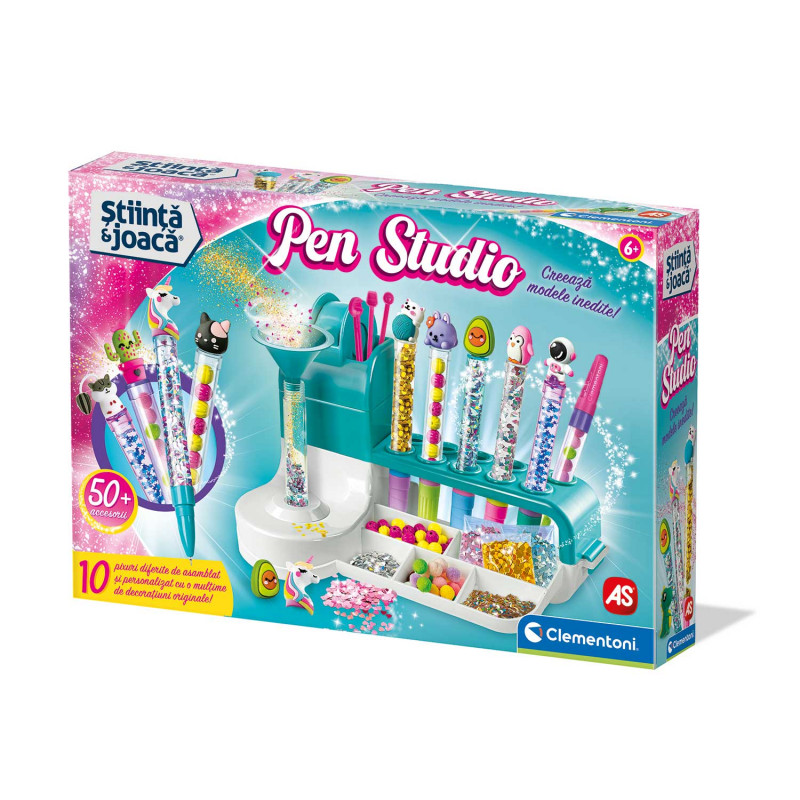 Pen Studio este un produs care stimulează imaginația și oferă copilului posibilitatea de a folosi, împărtăși și arăta creațiile sale, propriile pixuri! Are peste 50 de accesorii diferite pentru decorarea pixurilor și 10 matrițe cu posibilitatea de a adăuga o culoare diferită de cerneală.