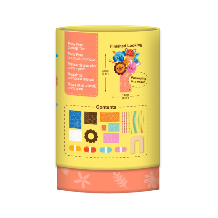 Materiale incluse: 6 bobine de fire colorate, un instrument de tesut pompom, 6 perechi de ochi si nas, forme de pasla pre-taiate, lipici si instructiuni detaliate.