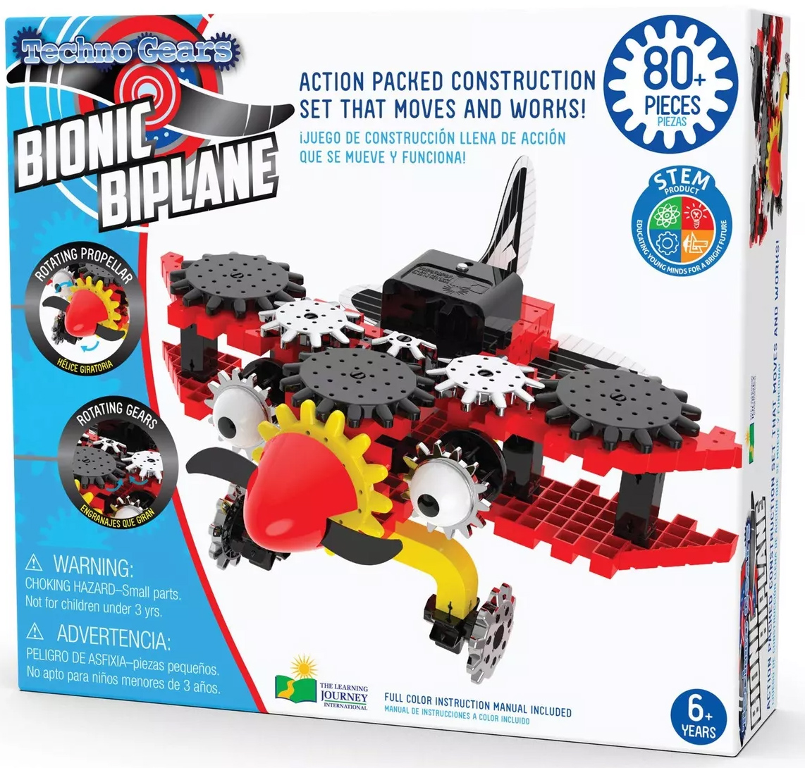- Cu peste 80 de piese de constructie colorate, precum plastic translucid colorat si piese cromate stralucitoare, roti dintate rotative si elice mobile, Biplanul include tot ceea ce micul constructor are nevoie pentru a-si construi propriul avion.