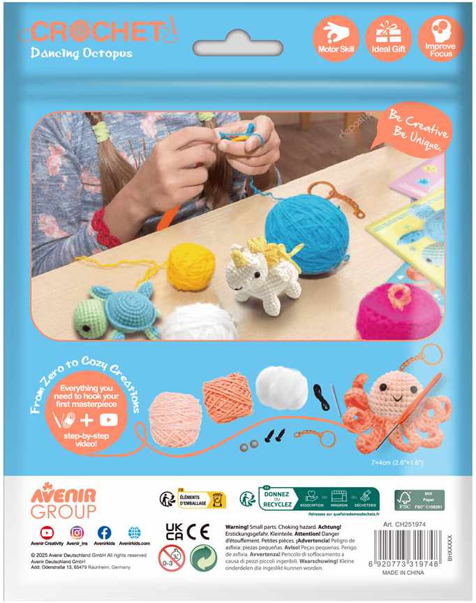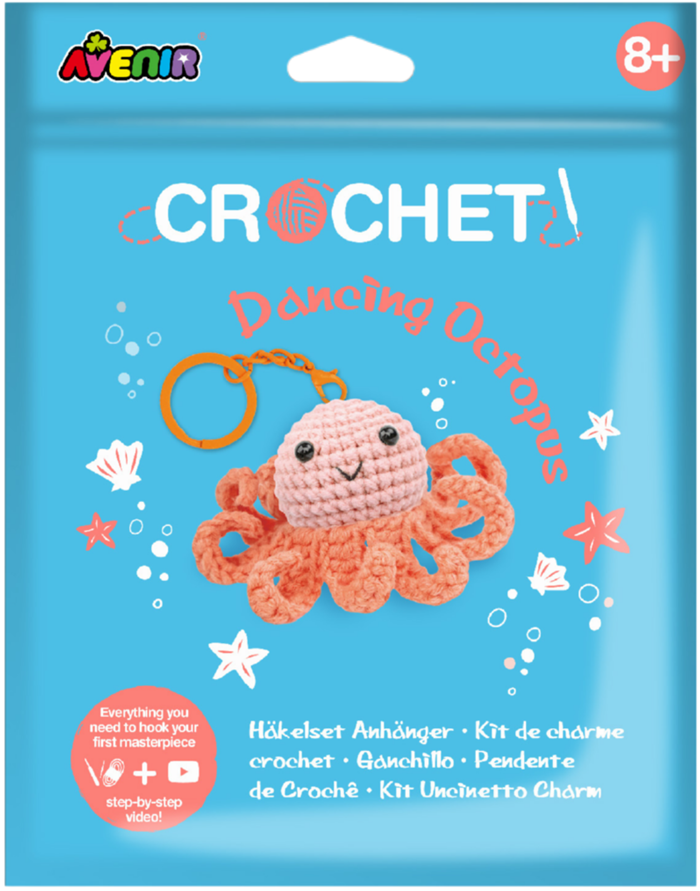 Setul de croșetat Caracatiță Dansatoare include absolut tot ce este necesar pentru a crea un accesoriu adorabil și fermecător în formă de caracatiță.