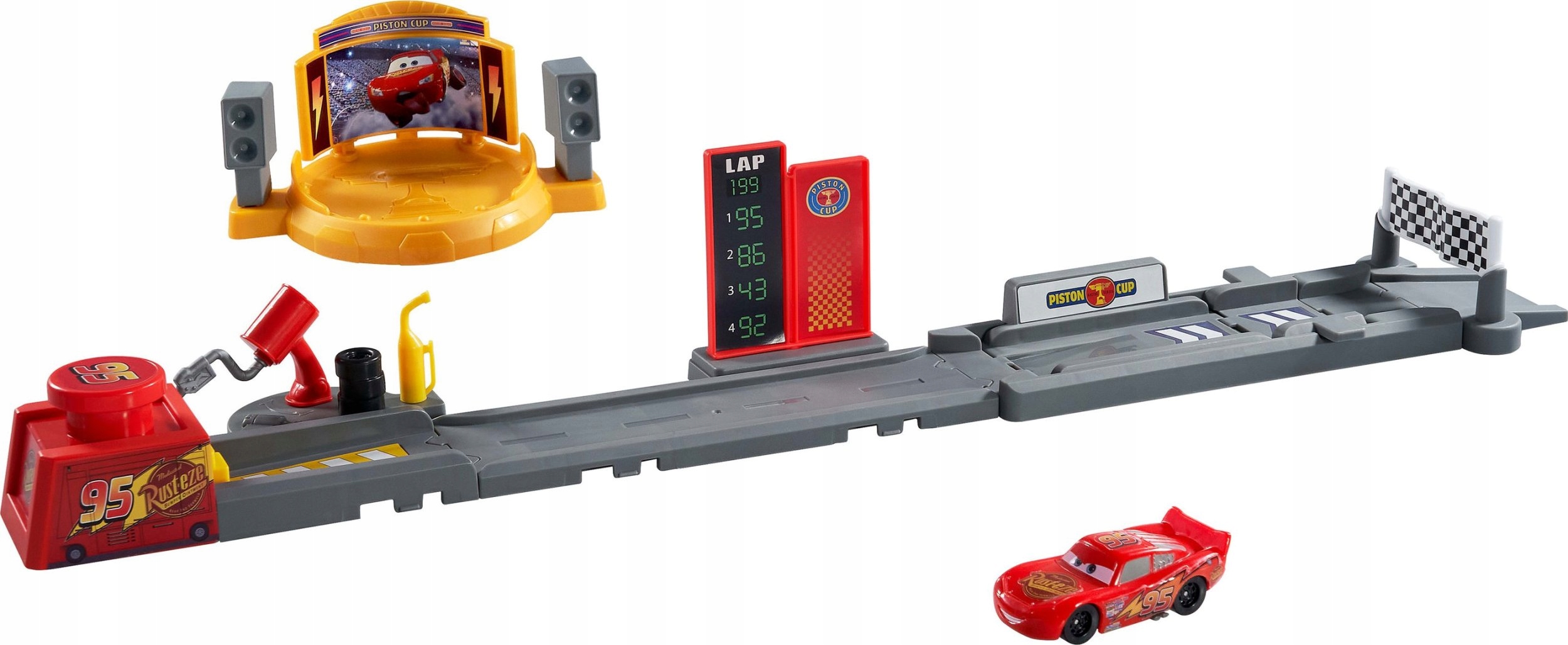 Setul de joaca Disney Pixar Cars pista de lansare are doua moduri de joc, astfel incat sa poti demonstra abilitatile de curse si cascadorii ale lui Fulger McQueen. Setul de joaca include detalii de impingere a masinilor, cum ar fi o zona de tuning cu accesorii detasabile, pentru a inspira povesti creative centrate pe personaje familiare. Plaseaza masinuta de jucarie Fulger McQueen inclusa in lansator si trimite-o in viteza pe pista si printre steagurile in carouri, facandu-le sa se roteasca, urmareste pe ecranul mare! Pentru a-si etala abilitatile de cascador, ridica rampa din mijlocul pistei de curse. Lanseaza-l pe Fulger McQueen si arunca-l peste steagul in carouri, aterizand in cercul castigatorilor. Variaza provocarea mutand cercul castigatorilor mai aproape sau mai departe. Are pilotul vedeta suficienta experienta?