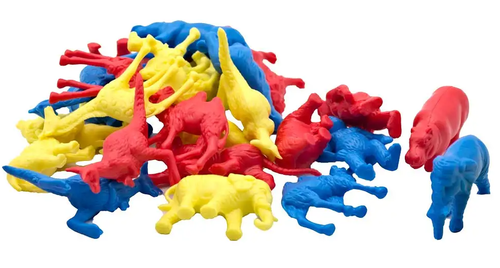 Setul de numarat si de sortat - Animale salbatice contine 30 de piese in 3 culori si o penseta. Dimensiune piesa 50mm. Contine piese din plastic non-toxic care fac apel la simtul senzorial si care pot contribui la dezvoltarea limbajului si competentelor matematice de baza, ca adunarea, scaderea si inmultirea. Permite utilizarea in multiple posibilitati combinatorii: sortat, numarat, recunoasterea culorilor, recunoasterea secventelor si pot fi folosite cu succes si in activitati cu copiii cu nevoi speciale. Produs cu activitati destinate varstei 3+.