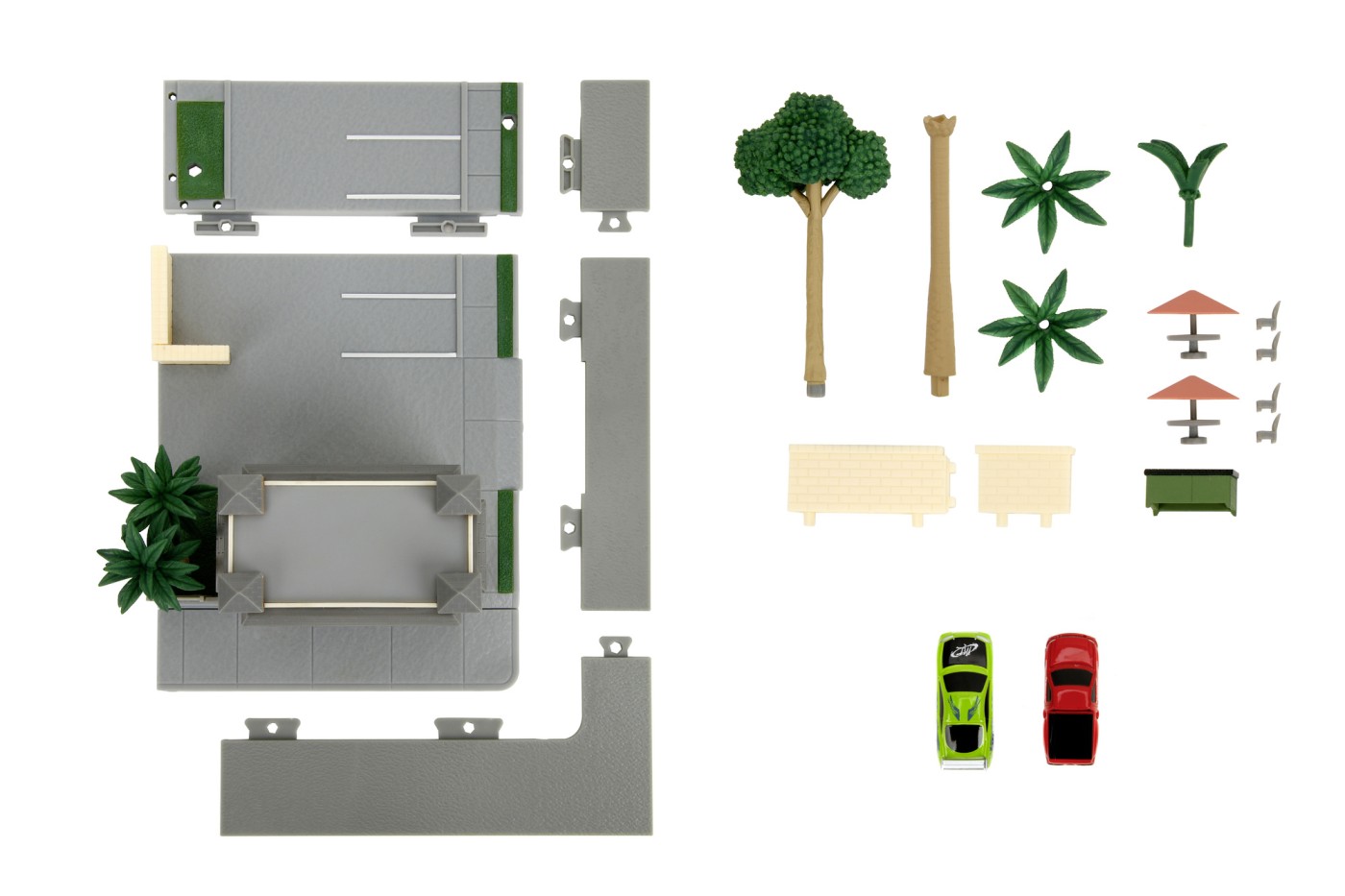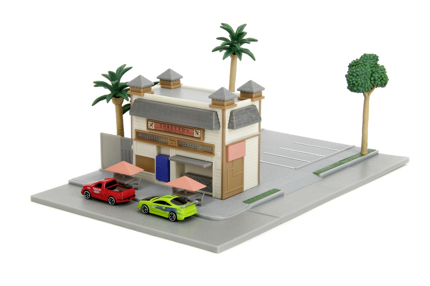 Set cu accesorii, mărime aprox. 13 x 20 x 18 cm. Compatibil cu toate figurinele Fast & Furious din linia Nano Metalfigs.