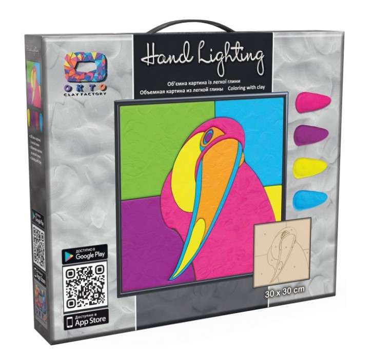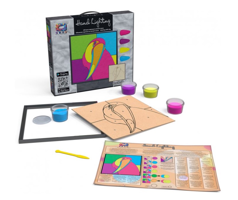 Setul conține placajul pe care se aplică argila, ramă, patru recipiente cu argilă ușoară de culori diferite, instrument de modelaj și instrucțiuni.