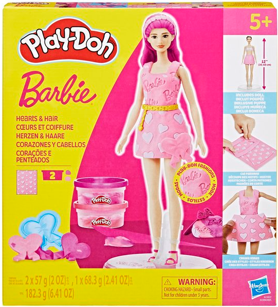 Inimioare și coafuri Play-Doh Barbie Creează stiluri super drăguțe cu setul Inimioare și păr! Este ușor și distractiv să creezi haine pentru păpușă Barbie Play-Doh cu acest kit de arte și meșteșuguri. Pur și simplu așează păpușa pe suport, folosește foaia cu modele Play-Doh și decupătoarele pentru a croi rochițe Barbie și îmbrac-o în cele mai creative moduri imaginabile. Oferă-i două coafuri Play-Doh diferite cu matrițele pentru păr scurt și lung, sau copiii își pot face propriile coafuri manual. Adaugă accesorii pentru păpușă Barbie, cum ar fi o curea și pantofi, pentru a-i completa aspectul. Menține joaca imaginativă cu două cutii de pastă de modelat Play-Doh pentru a adăuga și mai multe detalii. Oferă un cadou fabulos de la modă copiilor care adoră seturile de joacă Barbie și jucăriile Play-Doh!