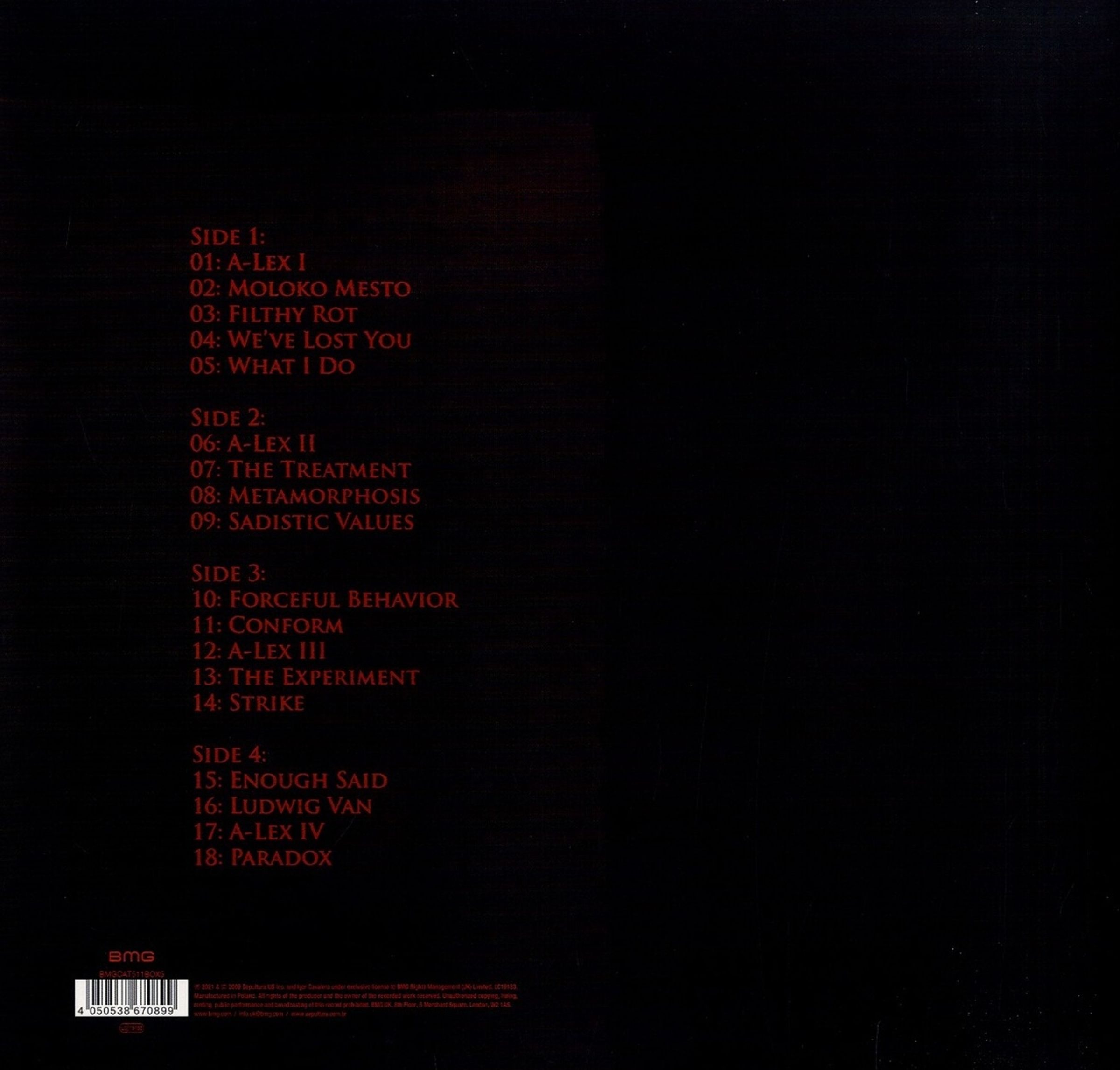 VINYL 1:A-Lex IMoloko Mesto Filthy Rot We've Lost You What I DoA-Lex II The Treatment Metamorphosis Sadistic ValuesVINYL 2: Forceful Behaviour Conform A-Lex III The Experiment Strike Enough Said Ludwig Van A-Lex IV Paradox