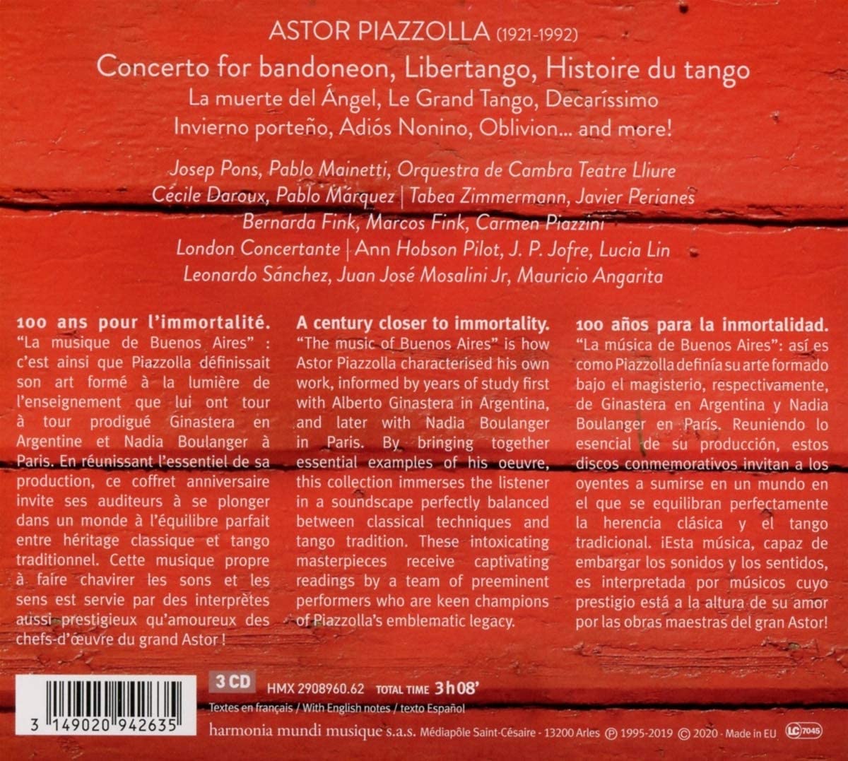 Astor Piazzolla characterised his own work as "The soundtrack of Buenos Aires." This boxed set marks the hundredth anniversary of the composer's birth by bringing together essential examples of his œuvre. This collection immerses the listener in a soundscape perfectly balanced between classical techniques and tango tradition. These intoxicating masterpieces receive captivating readings by a team of preeminent performers who are keen champions of Piazzolla's emblematic legacy.