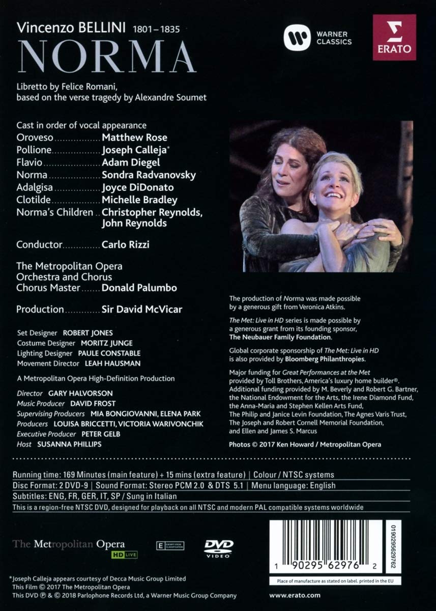 To open the Met’s 2017–18 season, powerhouse soprano Sondra Radvanovsky tackled one of opera’s most fearsome roles, the title druid priestess of Bellini’s Norma, who wrestles with love and betrayal before making the ultimate sacrifice on a funeral pyre. Mezzo-soprano Joyce DiDonato sang Norma’s friend and rival, Adalgisa, in Sir David McVicar’s evocative production. To open the Met’s 2017–18 season, powerhouse Bellini: Norma (Met Live Recording) Running time: 169 Minutes (main feature) + 15 mins (extra feature) / Colour / NTSC systems Sound Format: Stereo PCM 2.0 & DTS 5.1 Menu language: English Cast in order of vocal appearance: Oroveso, Matthew Rose Pollione, Joseph Calleja Flavio, Adam Diegel Norma, Sondra Radvanovsky Adalgisa, Joyce DiDonato Clotilde, Michelle Bradley Norma’s Children, Christopher Reynolds, John Reynolds Conductor, Carlo Rizzi The Metropolitan Opera Orchestra and Chorus Chorus Master, Donald Palumbo Production, Sir David McVicar Set Designer, Robert Jones Costume Designer, Moritz Junge Lighting Designer, Paule Constable Movement Director, Leah Hausman A Metropolitan Opera High-Definition Production Director, Gary Halvorson Music Producer, David Frost Supervising Producers, Mia Bongiovanni, Elena Park Producers, Louisa Briccetti, Victoria Warivonchik Executive Producer, Peter Gelb Host, Susanna Phillips