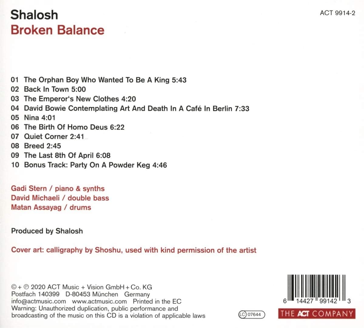 Shalosh capture this attitude in their music, and especially in "Broken Balance". "More drama, more pushing at the extremes, more sideways looks" - that was the motto for the album. The Tel Aviv-based trio cheerfully mix and contrast styles and genres; they're far too nimble to be categorized. They play with the complementary extremes of strength of impact and fragility. "We are always Shalosh. That is how we act, as one; our sound can be swing...or death metal." There is nothing random about their musical choices, however. Shalosh is like one organism, its parts instinctively breathing together. They tell stories too. Because Shalosh genuinely do have something to say. They want to inspire, to make references, to ask questions, and the miracle is that they do it all wordlessly.