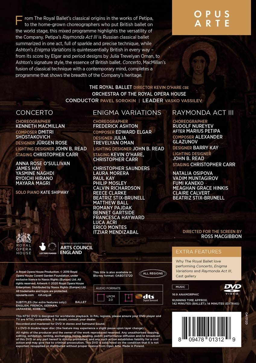 From The Royal Ballets classical origins in the works of Petipa, to the home-grown choreographers who put British Ballet on the world stage, this mixed programme highlights the versatility of the Company. Petipas Raymonda Act III is Russian classical ballet summarized in one act, full of sparkle and precise technique, while Ashtons Enigma Variations is quintessentially British in every way from its score by Elgar and period designs by Julia Trevelyan Oman, to Ashtons signature style, the essence of British ballet. Concerto, MacMillans fusion of classical technique with a contemporary mind, completes a programme that shows the breadth of the Companys heritage.