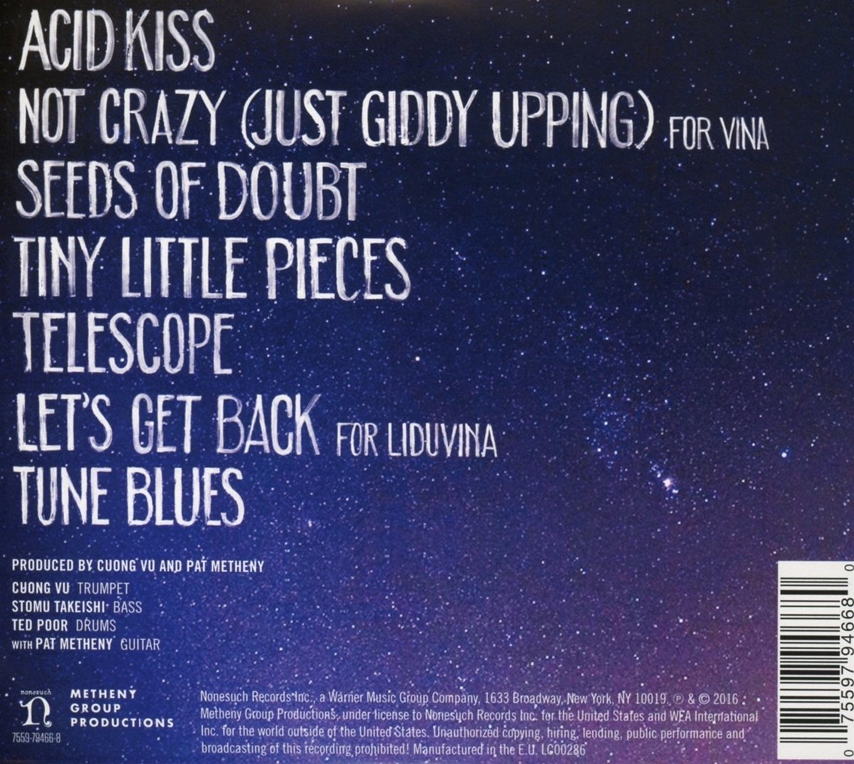 The Cuong Vu Trio includes Stomu Takeishi on bass and Ted Poor on drums. Metheny says of his record with the Trio, "This project is something that Cuong and I have talked about doing for years. For as much as I loved what Cuong has brought to my bands along the way, I always wondered what it would be like to join his group for a project, to see what I might be able to offer those guys. Cuong came up with a great set of tunes for the project, and we all met in NYC for a few days and recorded this music quite quickly and spontaneously."