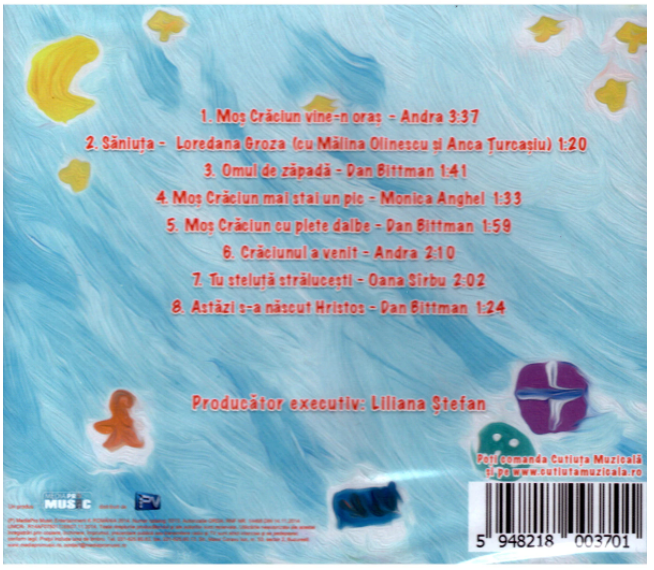 Mos Craciun, stelute, zapada, sania, bucuria copiilor, toate sunt vedetele acestor cantecele vesele interpretate de nume celebre: Andra, Oana Sirbu, Dan Bittman, Loredana, Monica Anghel, Anca Turcasiu, Malina Olinescu.