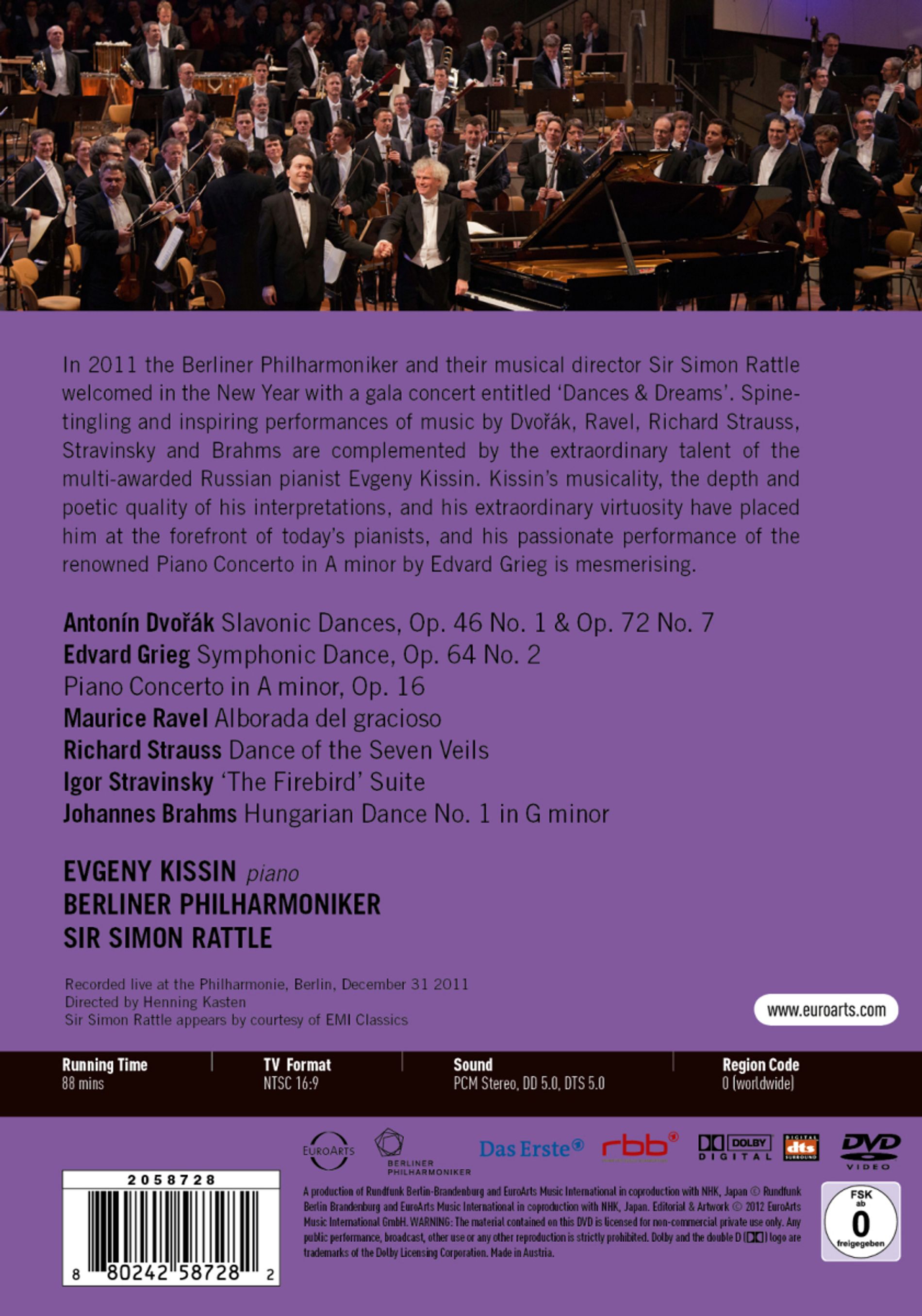 Spine tingling and inspiring performances of music by Dvorak, Ravel, Richard Strauss, Stravinsky and Brahms are complemented by the extraordinary talent of the multi-awarded Russian pianist Evgeny Kissin. Kissins musicality, the depth and poetic quality of his interpretations, and his extraordinary virtuosity have placed him at the forefront of todays pianists, and his passionate performance of the renowned Piano Concerto in A minor by Edvard Grieg is mesmerizing.