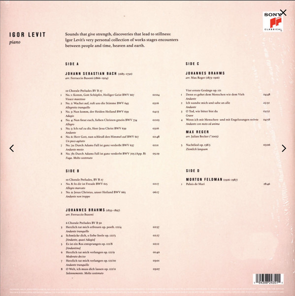 The 33-year-old once again steps beyond the limits of pure piano repertoire: in the Busoni transcriptions of Bach’s chorale preludes and the late Brahms, which are rarely heard as complete cycles, Levit assumes the role of an organist who fills vast church spaces. In Johannes Brahms’s Vier ernste Gesänge, he lends instrumental eloquence to overcoming the torments of fearing death. On the other hand, the gentle shimmer produced from its very few notes makes Morton Feldman's extremely quiet work for piano, Palais de Mari (1986), the epitome of a sensuous, transcendental realm of possibilities.