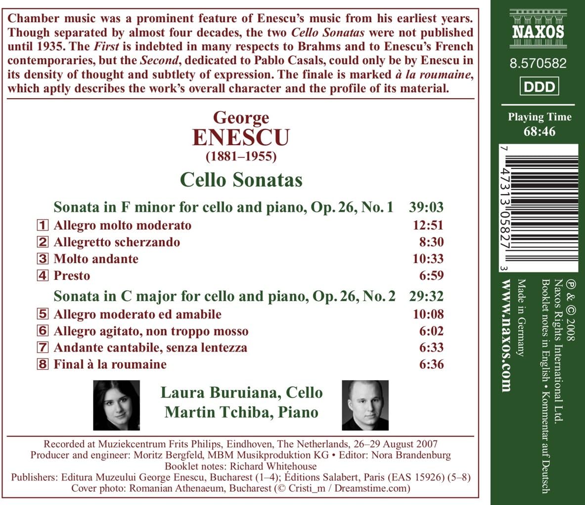 This Naxos album features cellist Laura Buruiana and pianist Martin Tchiba in what could have been a reference recording of these sonatas. Buruiana's playing is technically brilliant, with spot-on intonation, sweeping musical gestures, and a clear understanding of the score and how her part dialogues with the piano. Likewise, Tchiba is an elegant pianist who produces a wealth of colors that are so necessary in the frequently changing tonal environment of the Second Sonata. The problem -- and it's a big one -- is balance. There are entire passages where the cello is quite simply inaudible. Buruiana appears to be scrubbing away, drawing as much sound from her instrument as possible. Whether the balance issue stems from overexuberance on the part of Tchiba or a mixing/microphone issue from Naxos is not completely clear, but the result is the same: it's difficult to recommend an album of Enescu's cello sonatas, no matter how well-performed they are, if the cello itself can't be heard clearly. (All Music Guide - Mike D. Brownell)