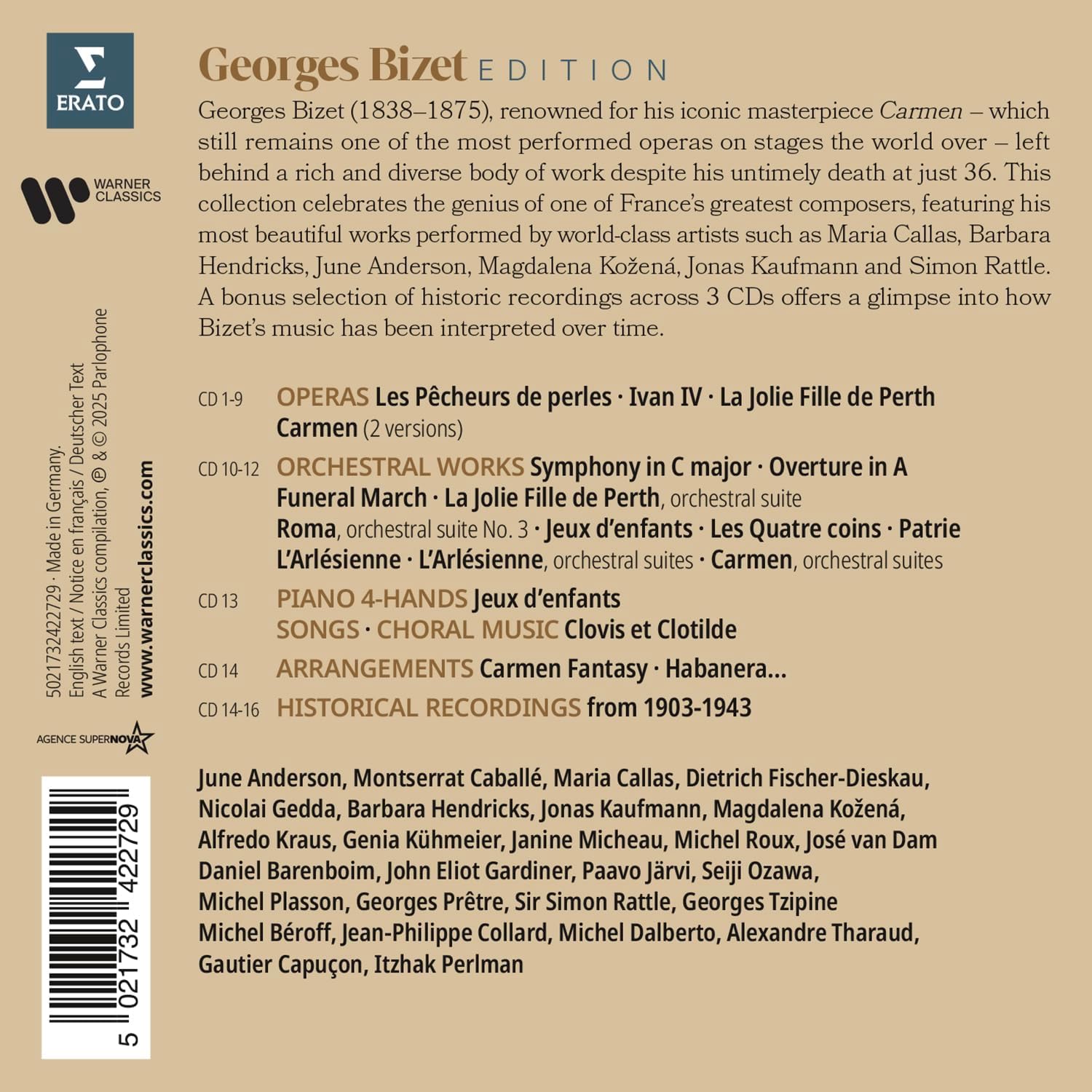 Historical Recordings 1903-1943 Symphony in C Major; Dramatic Overture “Patrie”; Jeux d’Enfants Suite, Op. 22; Roma Suite (excerpts); La Jolie Fille de Perth Suite; L’Arlésienne Incidental Music; Carmen Suite No. 1; Carmen (excerpts); Les Pêcheurs de Perles (excerpts)