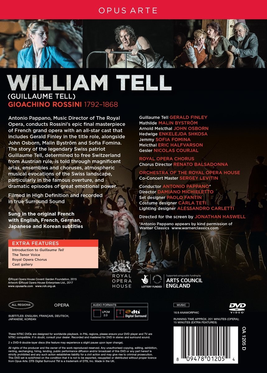Antonio Pappano, Music Director of The Royal Opera, conducts Rossini's epic final masterpiece of French grand opera with an all-star cast that includes Gerald Finley in the title role, alongside John Osborn, Malin Byström and Sofia Fomina. The story of the legendary Swiss patriot Guillaume Tell, determined to free Switzerland from Austrian rule, is told through magnificent arias, ensembles and choruses, atmospheric musical evocations of the Swiss landscape, particularly in the famous overture, and dramatic episodes of great emotional power.