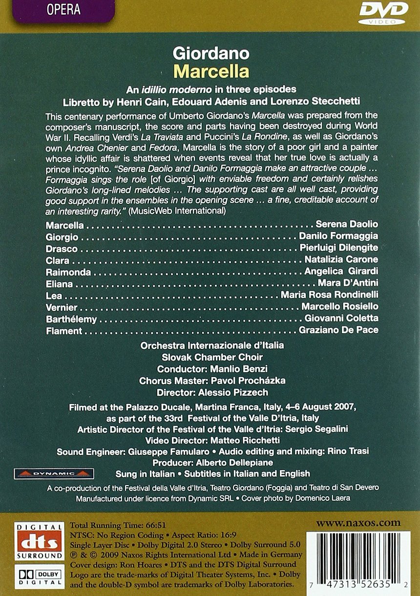 This centenary performance of Umberto Giordano's 1907 opera Marcella, performed at the Palazzo Ducale in Martina Franca, Italy in August 2007 as part of the 33rd Festival of the Valle D'Itria, was prepared from the composer's manuscript, the score and parts having been destroyed during World War II. The opera tells the story of a poor girl and a painter whose idyllic affair is shattered when it is revealed that her true love is actually a prince.