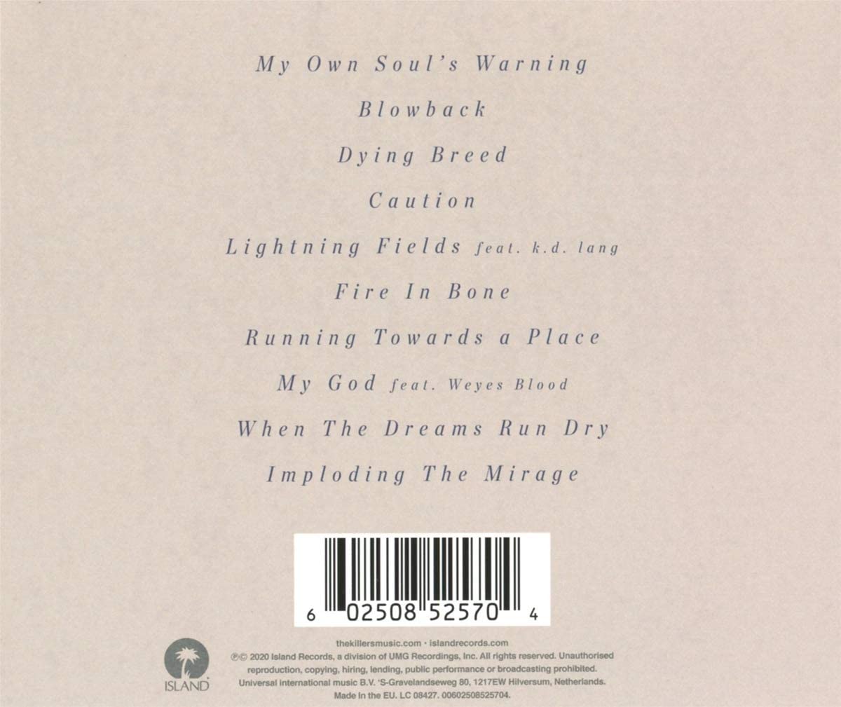 Imploding the Mirage is the 6th studio album by American rock band the Killers. It was released on August 21, 2020, by Island Records in the United States and internationally by EMI. It is the band's first album without lead guitarist Dave Keuning, who has not toured or recorded with the Killers since he took an indefinite hiatus from the band in 2017. Guitar parts are covered by Killers bassist Mark Stoermer, producer Jonathan Rado, and a variety of guest musicians including Lindsey Buckingham (Fleetwood Mac) and Adam Granduciel (The War on Drugs).
