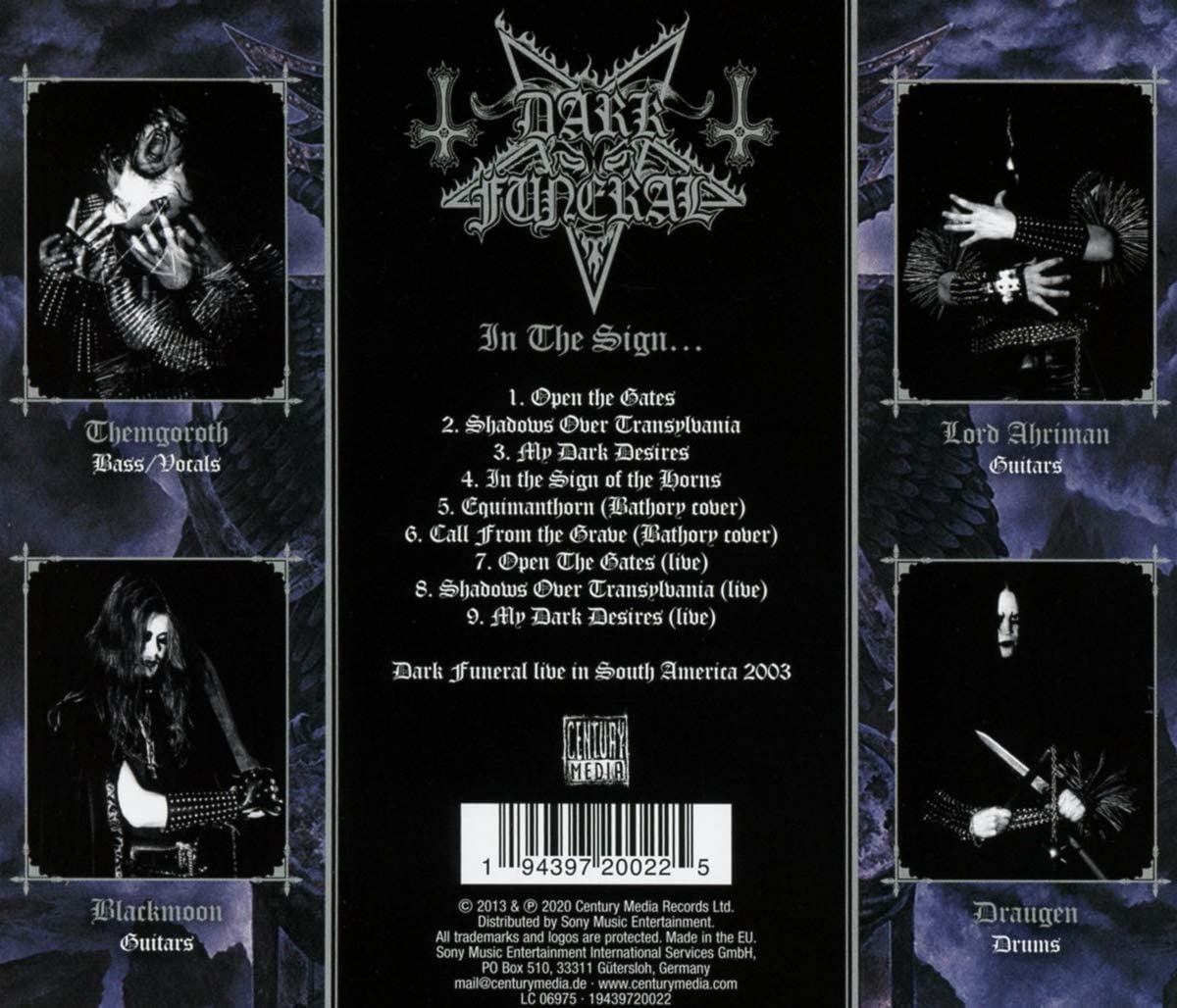"In The Sign." compiles the debut self-titled MCD by Swedish black metal overlords DARK FUNERAL plus 2 Bathory cover versions and 3 live tracks recorded in South America in 2003 in absolutely stunning quality. Expanded with liner notes, new layout, remastered sound and unseen photos this is the definite version of this classic black metal opus.With a sense of disbelief the writer of these lines stared at the TV screen two decades ago when watching the clip for "The Secrets Of The Black Arts", the title track of Swedish black metal act DARK FUNERAL's 1996 debut album. It's needless to say that after catching his breath, another soul had been successfully corrupted. The relentless, oppressive speed, the hysterical screams uttering an endless litany of blasphemies, the spine-chilling melodies, the flames, the blood, DARK FUNERAL had set new standards in terms of fury and extremity. Formed back in 1993 by Lord Ahriman and Blackmoon (R.I.P.) and releasing the classic self-titled MCD just a year later, it was "The Secrets Of The Black Arts" which quickly turned DARK FUNERAL into one of the leading acts of the second wave of black metal next to other legends such as Marduk, Emperor, and Darkthrone. In the ensueing years a string of truly merciless studio albums, worldwide tours, festival shows, and impressive live performances kept them not only in high demand on the live circuit but also resulted in a strong bond with a maniacal global fan-base, who supported them through thick and thin.Their release "In The Sign." compiles the debut self-titled MCD by Swedish black metal overlords DARK FUNERAL plus 2 Bathory cover versions and 3 live tracks recorded in South America in 2003 in absolutely stunning quality. Expanded with liner notes, new layout, remastered sound and unseen photos this is the definite version of this classic black metal opus.
