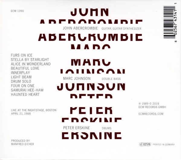 Personnel: John Abercrombie (guitar, guitar synthesizer); Marc Johnson (double bass); Peter Erskine (drums)
