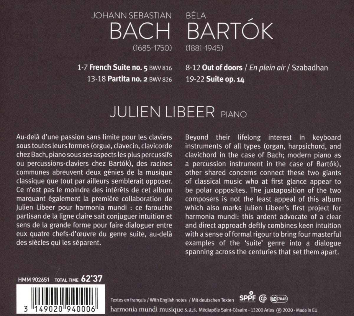 Beyond their lifelong interest in keyboard instruments of all types (organ, harpsichord and clavichord in the case of Bach; modern piano as a percussion instrument in the case of Bartók), other shared concerns connect these two giants of classical music who at first glance appear to be polar opposites. Julien Libeer, this ardent advocate of a clear and direct approach deftly combines keen intuition with a sense of formal rigour to bring four masterful examples of the 'suite' genre into a dialogue spanning across the centuries that set them apart.