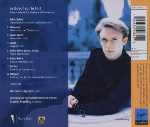 Just another disc of flashy French frippery? Actually, no. You may not have heard of violinist Renaud Capuçon but on the basis of this recital CD, he's an A-list player, no question. And it's a well chosen recital, too, combining the popular (Massenet's "Méditation", Saint-Saëns' Introduction et rondo capriccioso) with some slightly more off-beat choices (Berlioz's Rêverie et caprice, Milhaud's Le Boeuf sur le toit in its violin-and-orchestra incarnation). Capuçon plays a Strad that once belonged to the great Fritz Kreisler, and the sound that he makes is ravishing and richly multi-faceted, whether in Saint-Saëns' fiendish Danse macabre or Ravel's gypsy-inspired Tgizane. Perhaps the best is left till last--Milhaud's own arrangement of Boeuf (intended, though never used, as an accompaniment to footage of Charlie Chaplin). Already outrageous in spirit and harmony in its purely orchestral guise, the addition of a fiendish solo part (complete with a manic cadenza by Honegger) seems to have inspired even greater musical malarkey. It's a piece that falls flat on its face if the players aren't up to it, but that's simply not an issue here. Capuçon's brilliance is matched throughout the disc by the playing of the Deutsche Kammerphilharmonie under the inspired leadership of Daniel Harding, and the recording is a fine one. The very thing to brighten the darkest of days. --Harriet Smith