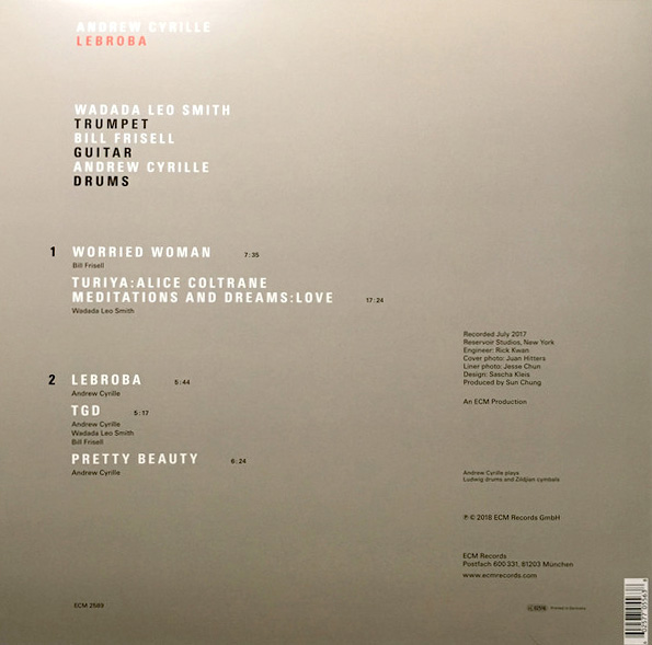 Each of them made his first ECM appearance long ago: drummer Andrew Cyrille on Marion Brown's Afternoon of a Georgia Faun (1970), trumpeter Wadada Leo Smith on his own classic Divine Love (1978), and guitarist Bill Frisell on Eberhard Weber's Fluid Rustle (1979); these are, of course, players of enduring influence. Frisell contributed to Cyrille's previous ECM disc The Declaration of Musical Independence, but Lebroba marks a first-time meeting for the guitarist and Wadada Leo Smith.