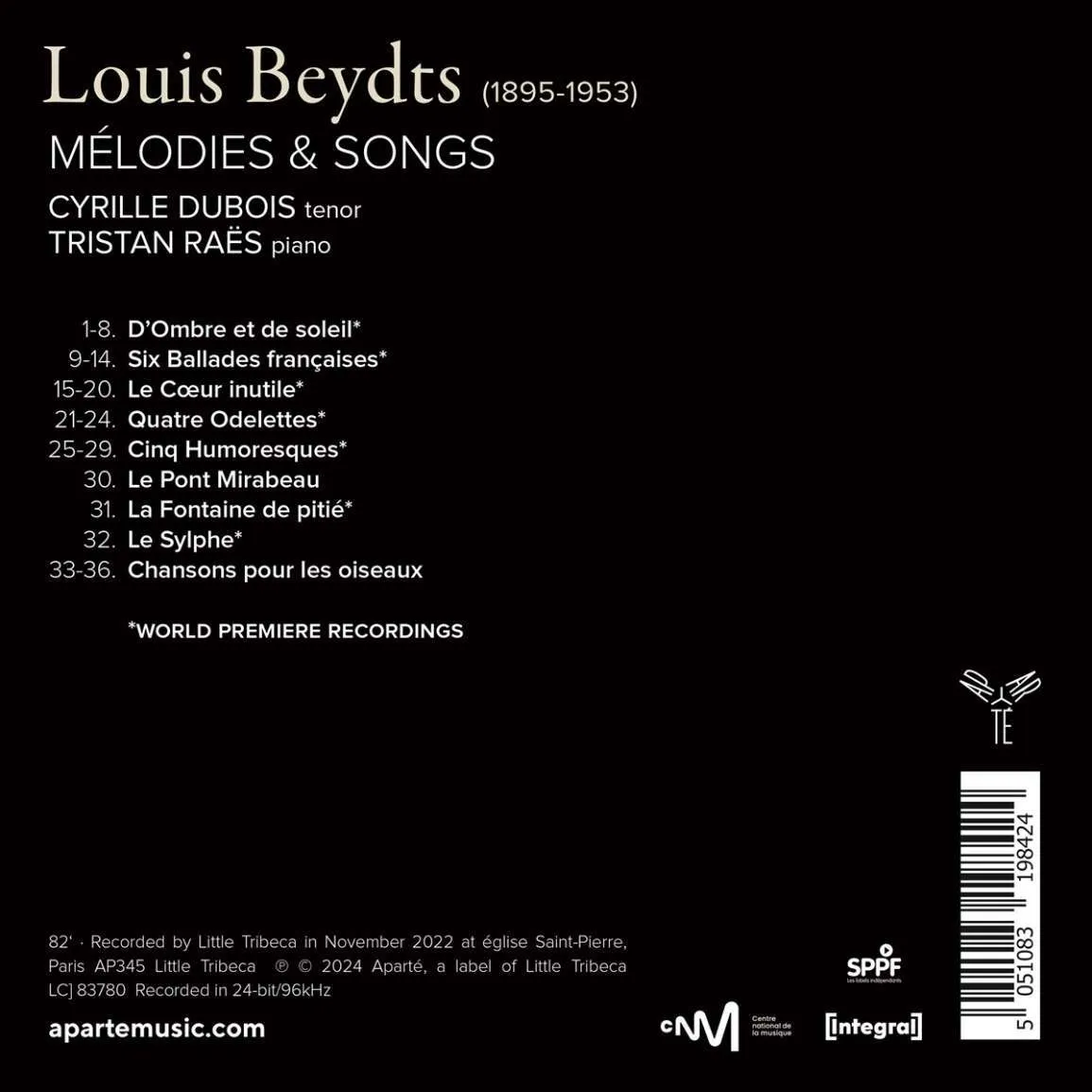 Cyrille Dubois is unstoppable: after two albums dedicated to Liszt and the Boulanger sisters, both acclaimed by the critics, and a flamboyant complete set of Fauré songs, the tenor is back to his preferred repertoire, the French art-song. He reunites with his accomplice, pianist Tristan Raës, to bring the Bordeaux composer Louis Beydts (1895-1953) out of oblivion, as most of his pieces are recorded here for the first time. From these miniatures, Cyrille Dubois draws the sap of the musician's art. A pure product of French hedonism, it is refined and elegant, with a generous vocality but also daring, for Beydts forbids himself nothing. Echoes of jazz and light music, of Hahn or Fauré, polymodality and polytonality, his melodies traverse everything between fantasy, humor and contemplation with supreme freedom. By transporting us into this singular universe, Cyrille Dubois establishes himself as an invaluable performer of the repertoire and a pioneer of French music, with an uncommon mastery of the combination of word and music.