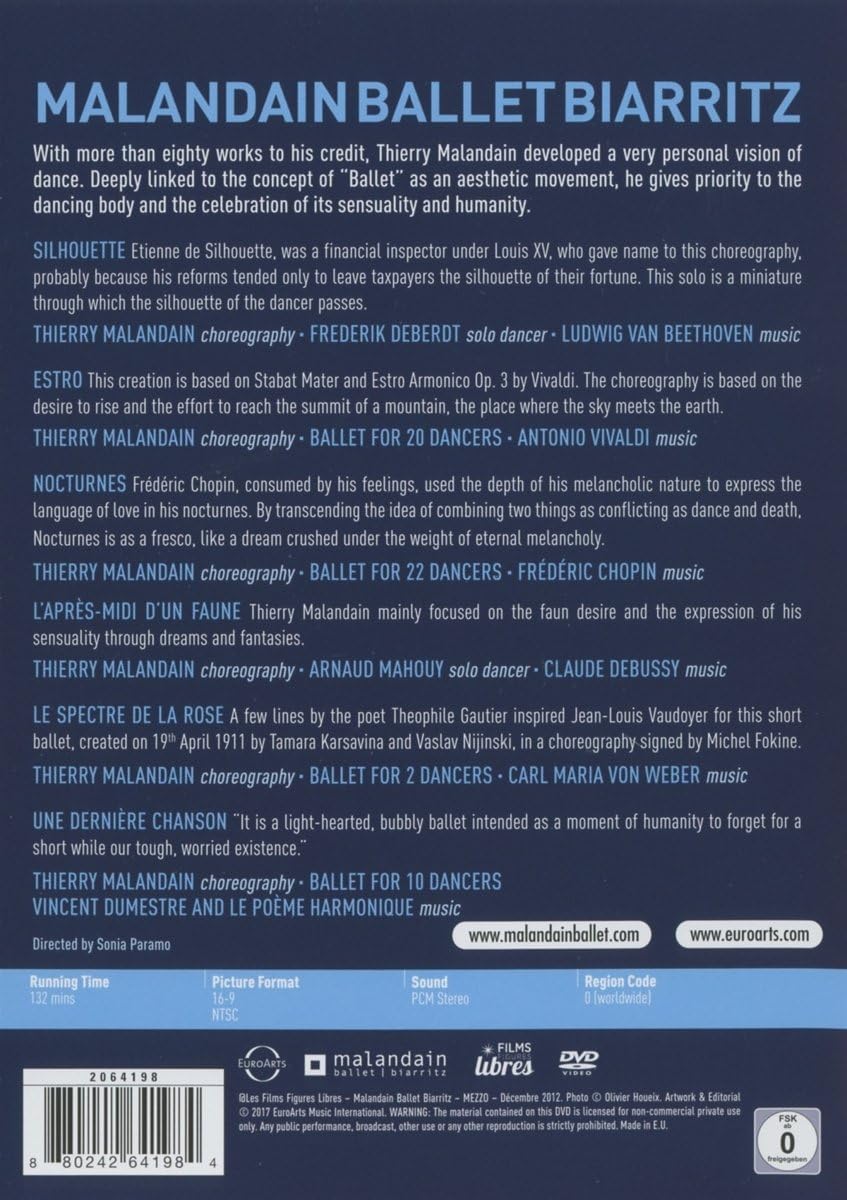 Collection of ballets performed by the Malandain Ballet Biarritz and choreographed by Thierry Malandain. The collection includes: 'Silhouette', performed in 2016 by solo dancer Frederik Deberdt, 'Estro' (2016), 'Nocturnes' (2016), 'L'Après-midi d'un faune' (2012), 'Le Spectre de la rose' (2012), and 'Une Dernière chanson' (2012).